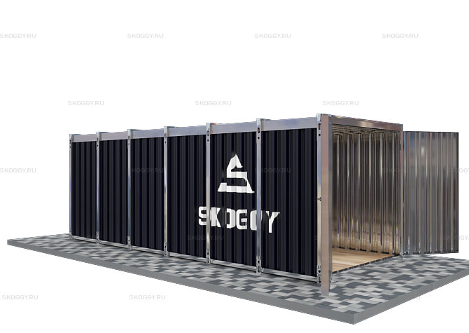 По своей конструкции контейнер Skoggy представляет модульное сооружение, которое состоит из сборных элементов. При сборке элементы устанавливаются один в другой и фиксируются болтовыми соединениями. Конструкция дверей, крыши и стен представляют собой каркас из сложногнутого профиля толщиной 0,7 мм. Каркас обшивается профлистом НС-35 толщиной 0,45-0,55 мм. Такая толщина оптимальна для обеспечения прочности и устойчивости конструкции.