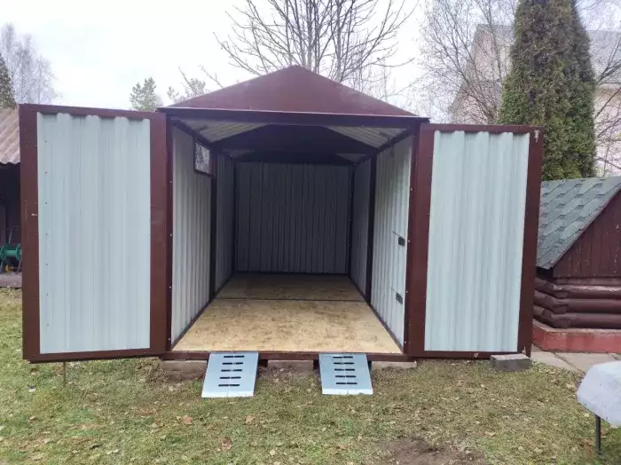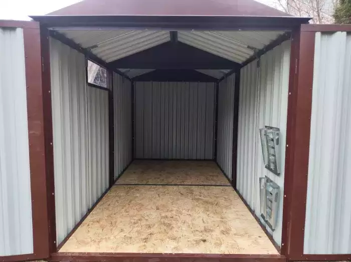 Нами была изготовлена 4-метровая конструкция с плоской крышей и торцевой воротной группой в красивейшей двойной расцветке. Хозяин участка увидел на нашем сайте в выполненных проектах варианты комбинированной расцветки и принял решение оформить постройку в шоколадном цвете RAL 8017, а на воротную группу нанести принт «под дерево» Наив Натурал, чтобы ворота не сливались по цвету с забором на участке.