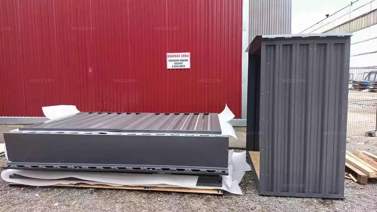 Изготовили конструкцию размером 3 х 4 м и высотой 2,69 м с двускатной крышей в неизменно топовом и стильном цвете RAL 7024. Перед установкой гаража заказчик самостоятельно подготовил площадку в виде подушки из щебня.