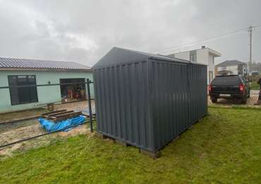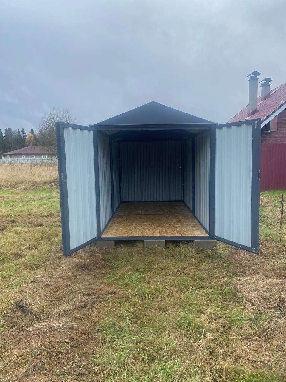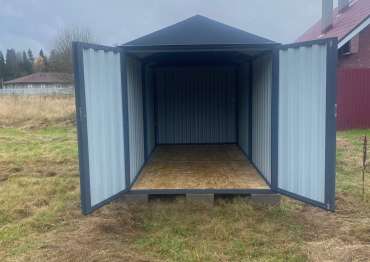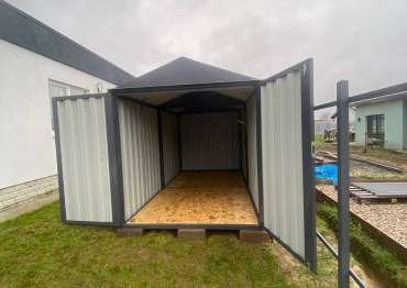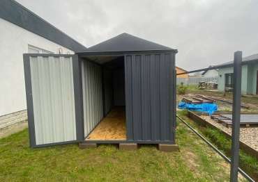 Нами были изготовлены две одинаковые 4-метровые конструкции с двускатной крышей и торцевой воротной группой в строгом графитовом цвете RAL 7024.