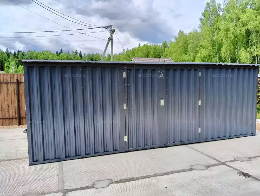 Проект: два 6-метровых хозблока с плоской крышей для хранения инвентаря и велосипедов в графитовом цвете.