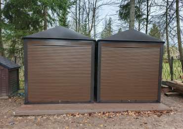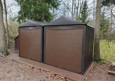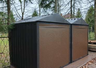 Нами были изготовлены две стандартные 2-метровые конструкции с двускатными крышами и торцевыми входными группами с рольставнями в благородном серо-коричневом цвете RAL 8019.