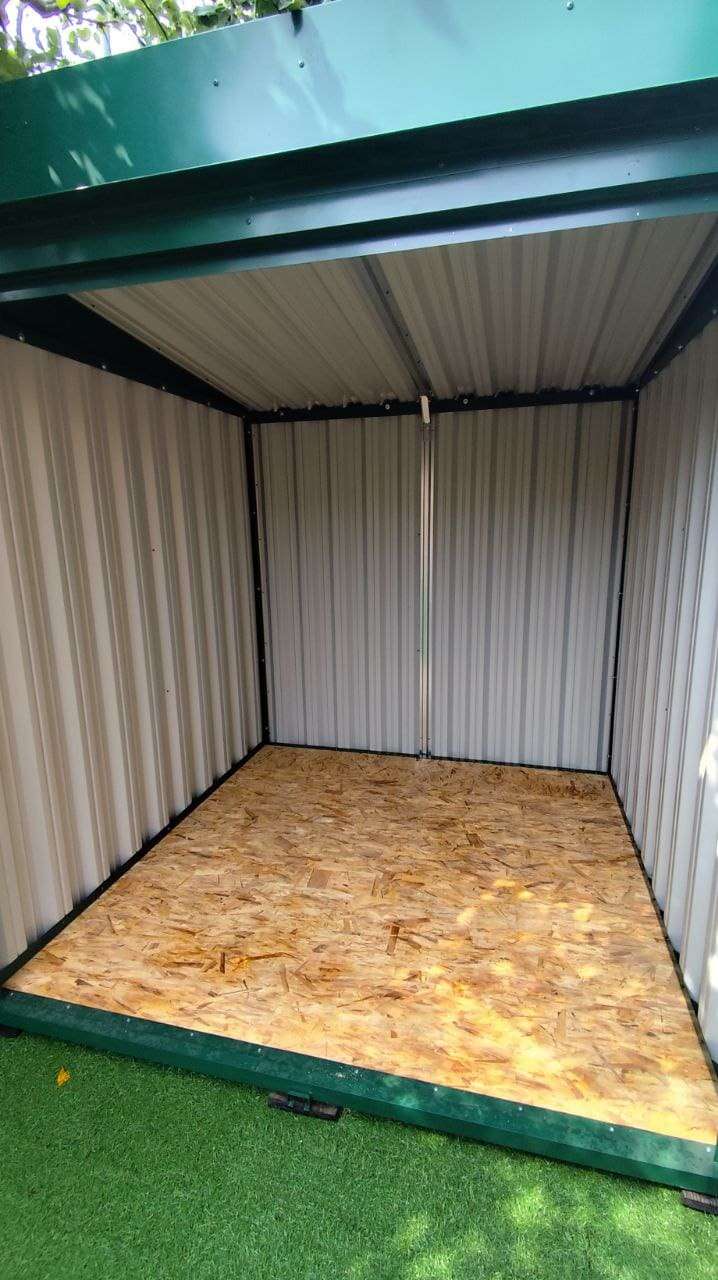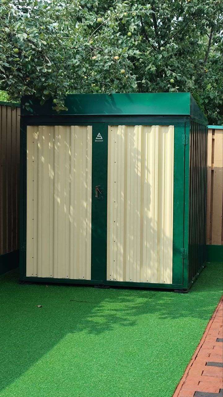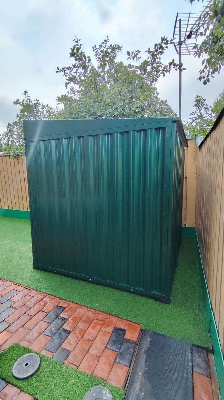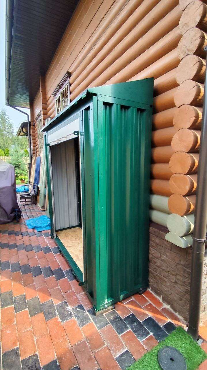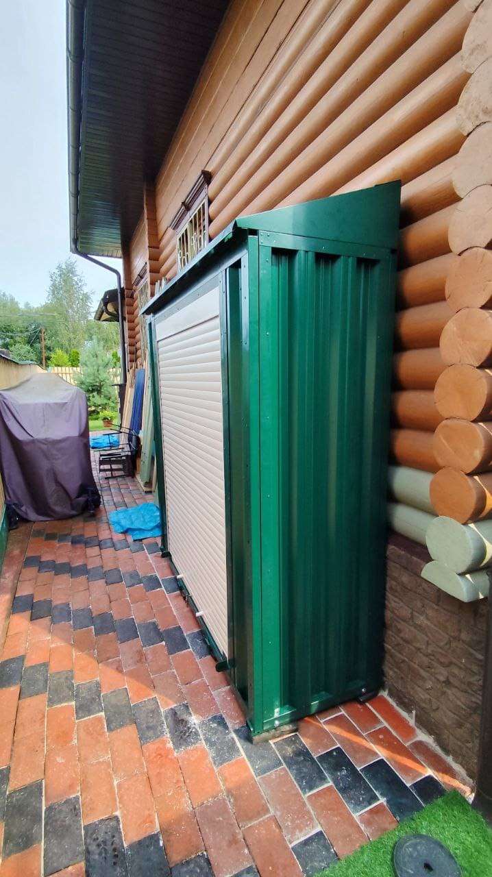 Также нами была изготовлена конструкция индивидуального размера 0,7 х 2 х 2,3 м с односкатной крышей и рольставнями в аналогичной комбинации цветов зеленого RAL 6005 и RAL 1014 «слоновая кость» для рольставней.