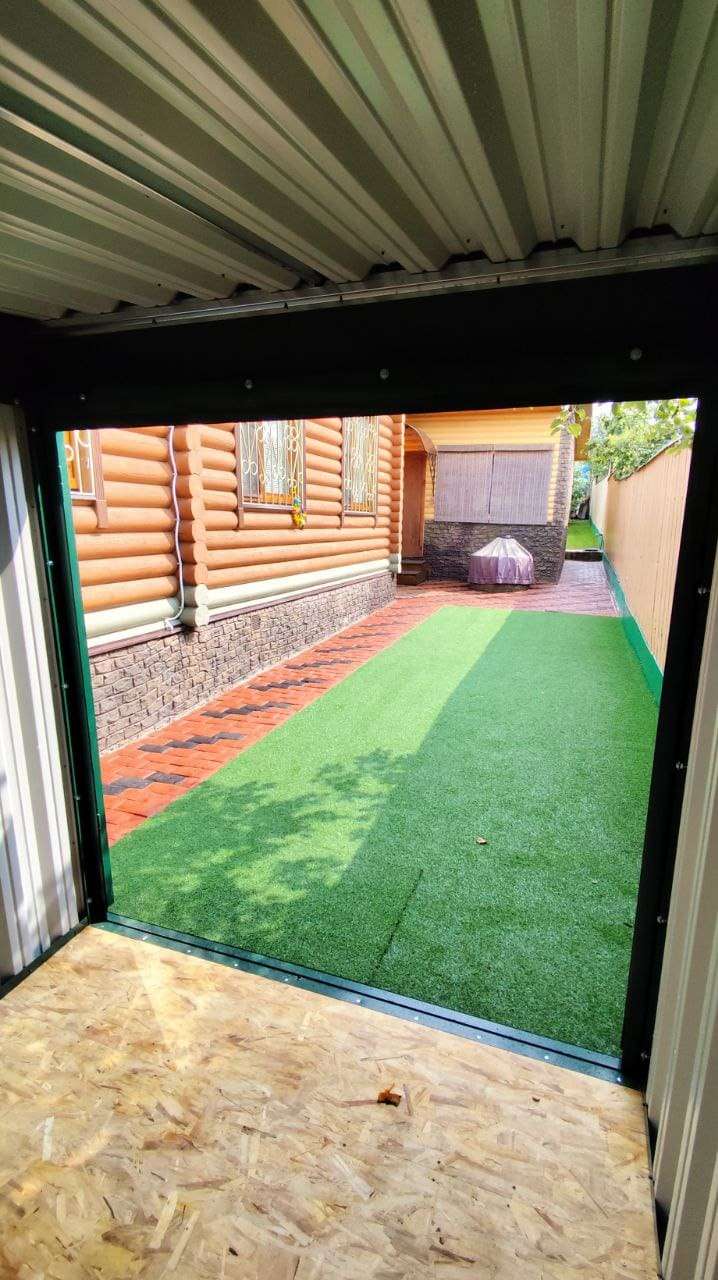 Нами была изготовлена конструкция 2 х 2 м с увеличенной высотой 2,30 м с односкатной крышей и торцевой воротной группой в необычном сочетании цветов RAL 6005 «зеленый мох» и нежного RAL 1014 «слоновая кость» для воротной группы.
