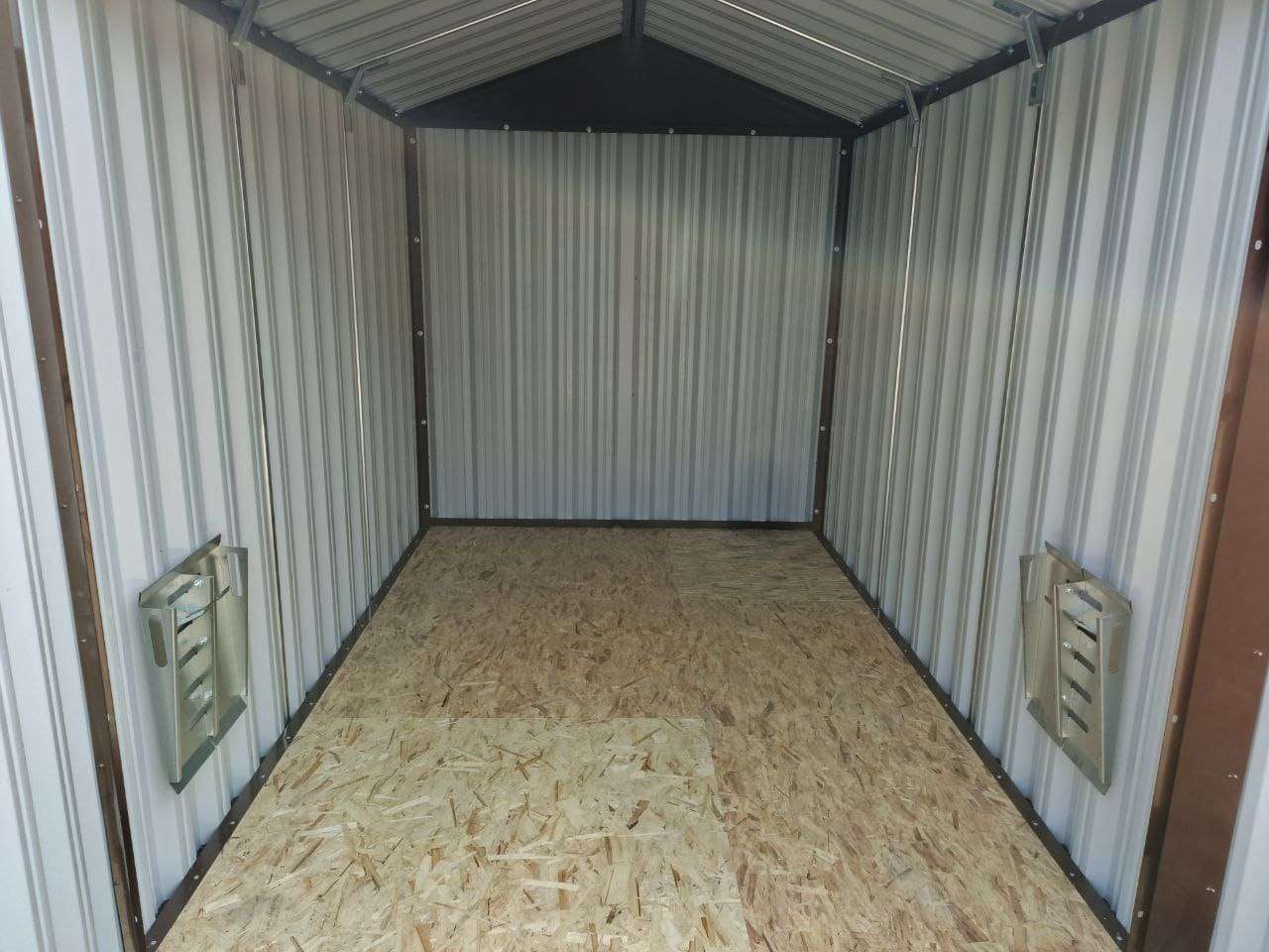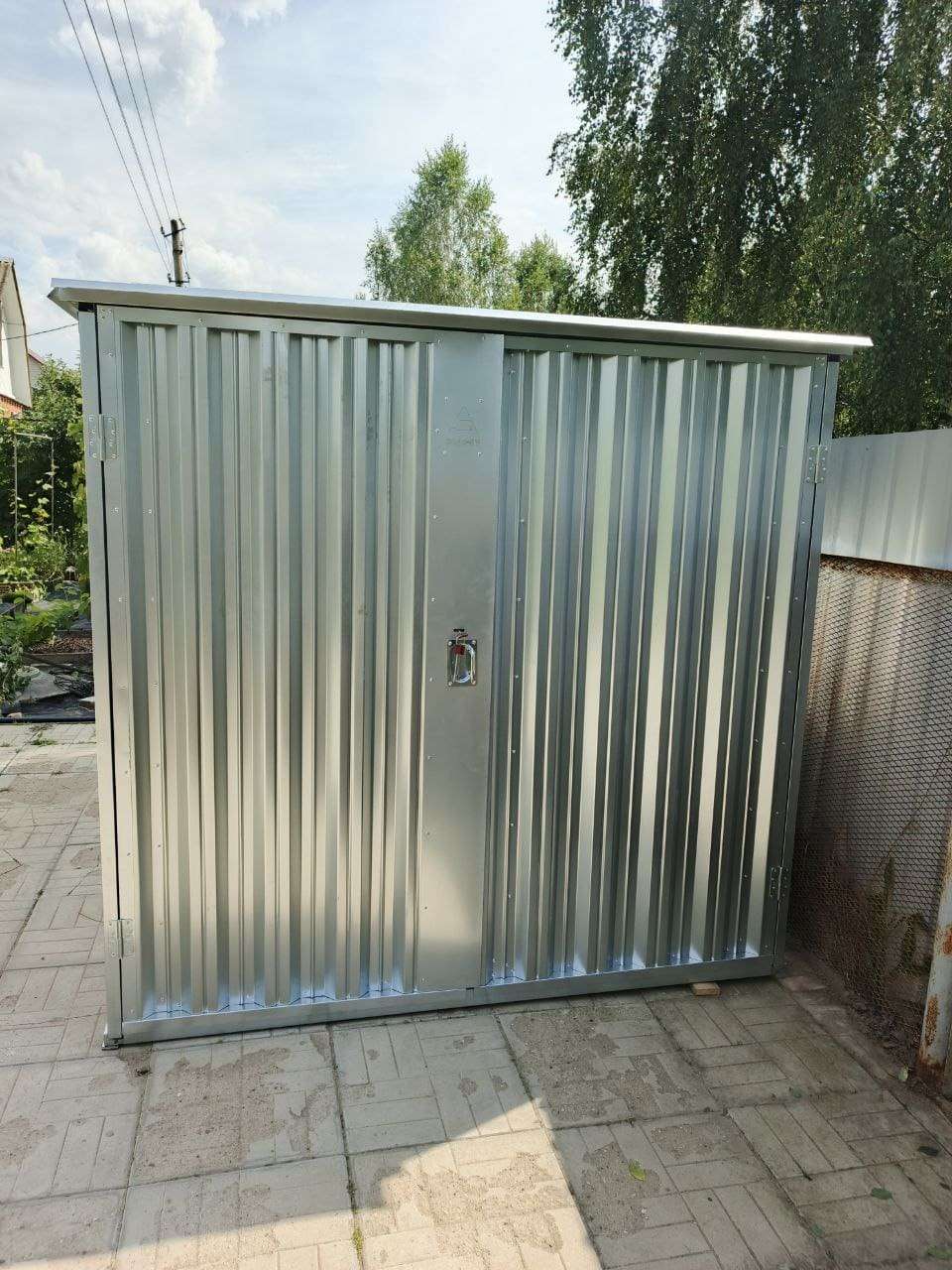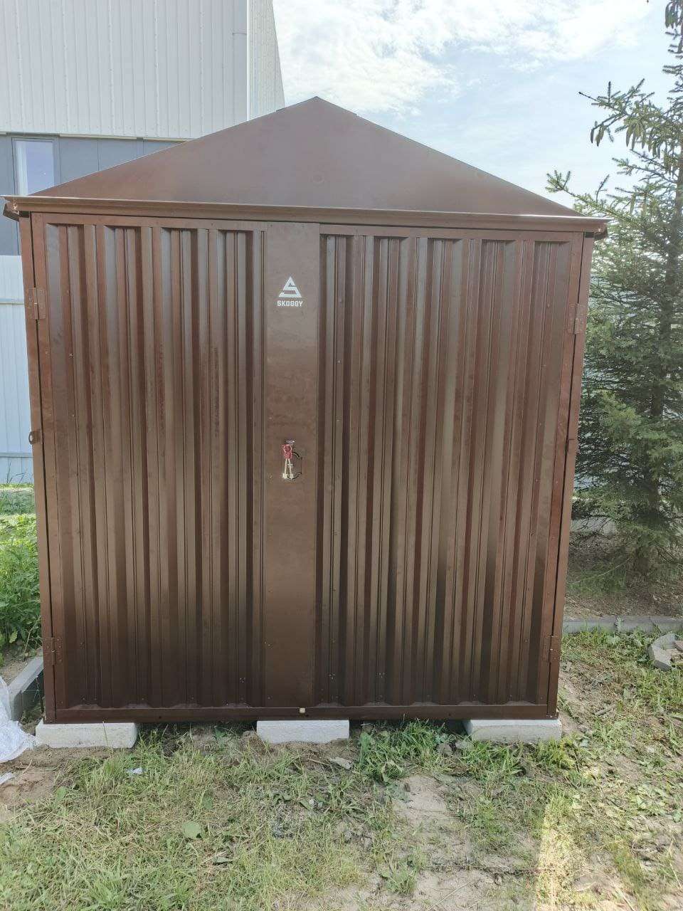 Проект: два 3-метровых хозблока для хранения садовой техники и инвентаря в шоколадно-коричневом и цинковом цветах.