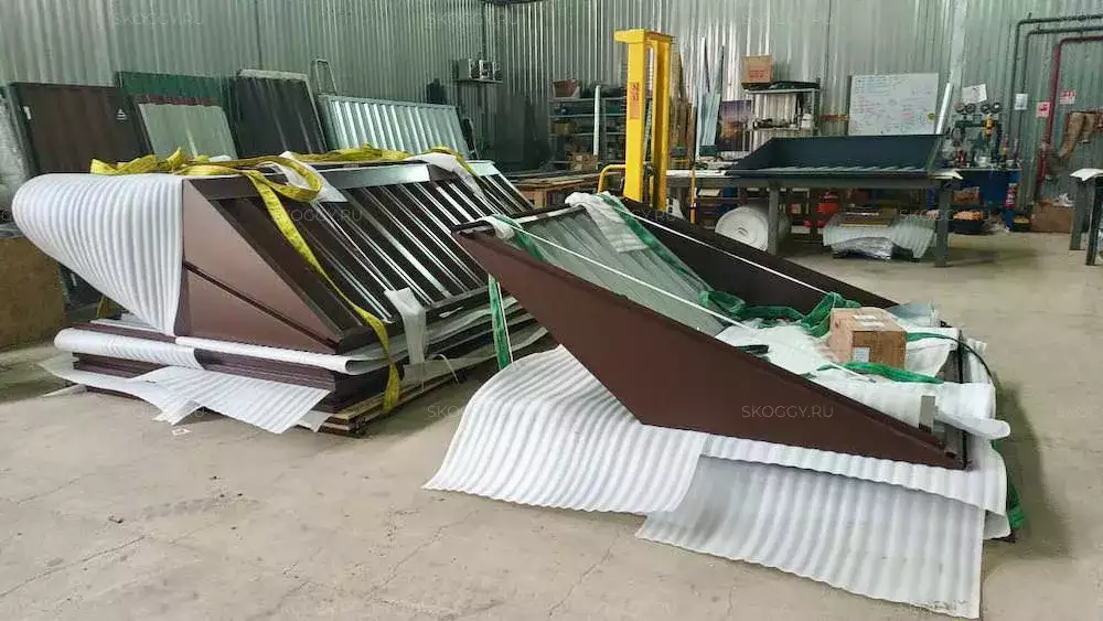 Нами были изготовлены две конструкции 2 м и 6 м с двускатной крышей и торцевой воротной группой в популярном шоколадно-коричневом цвете RAL 8017. Малую постройку дополнительно оборудовали прямым стеллажом с тремя полками и системой хранения инвентаря.