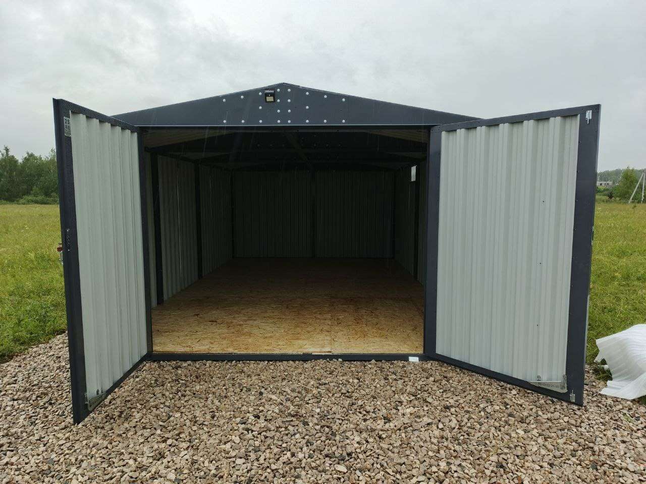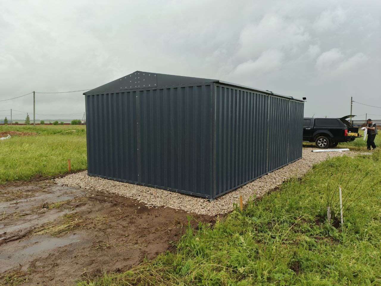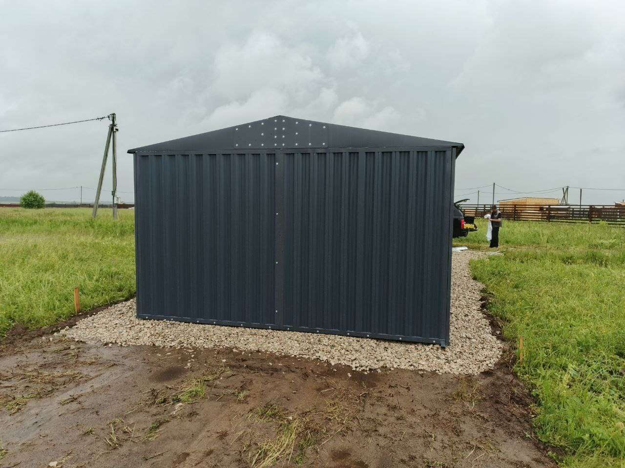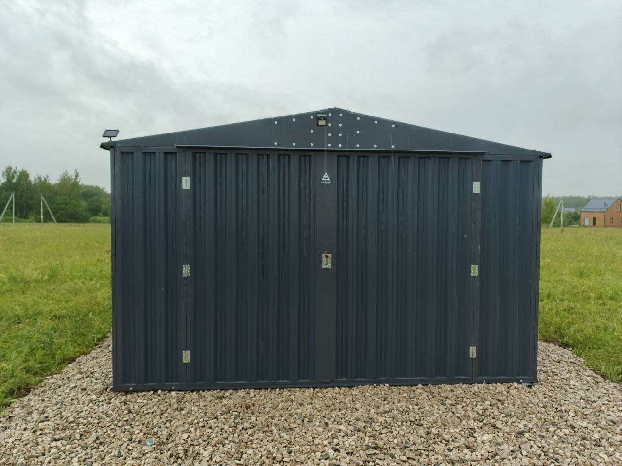 Нами была изготовлена широкая конструкция размером 5 х 4 х 2,69 м с двускатной крышей и торцевой воротной группой в строгом графитовом цвете RAL 7024.