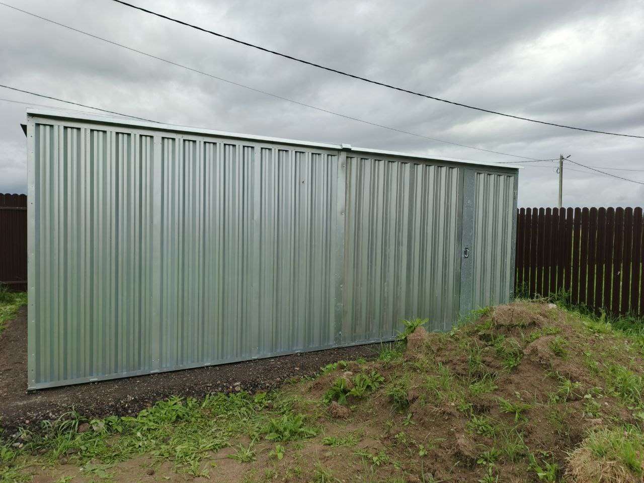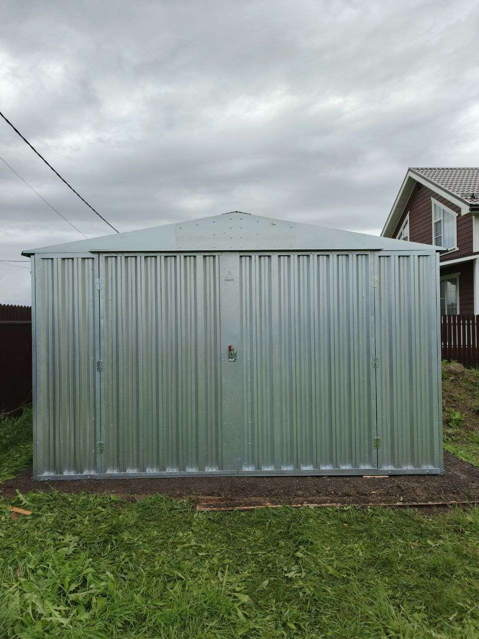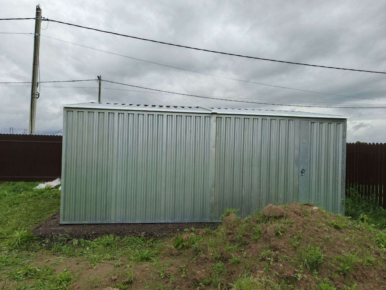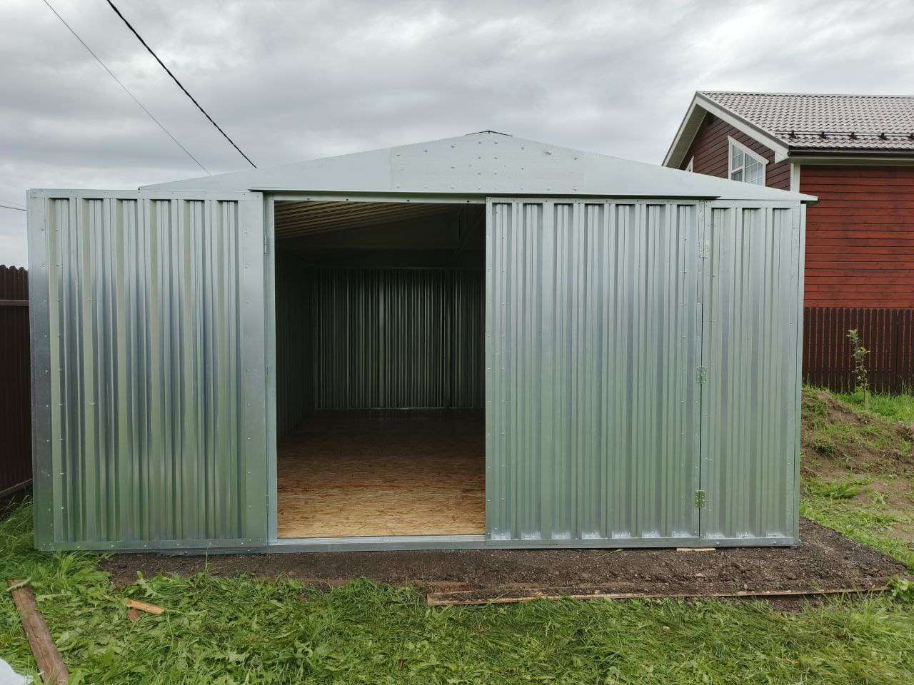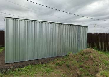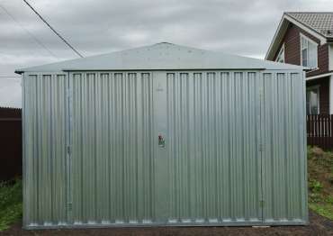 Нами была изготовлена широкая 6-метровая конструкция с увеличенной высотой 2,69 м с двускатной крышей и торцевой воротной группой в блестящем цинковом цвете.