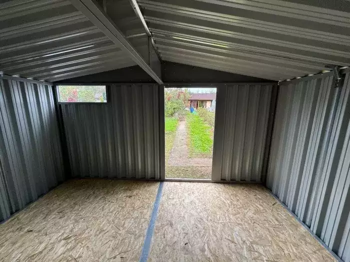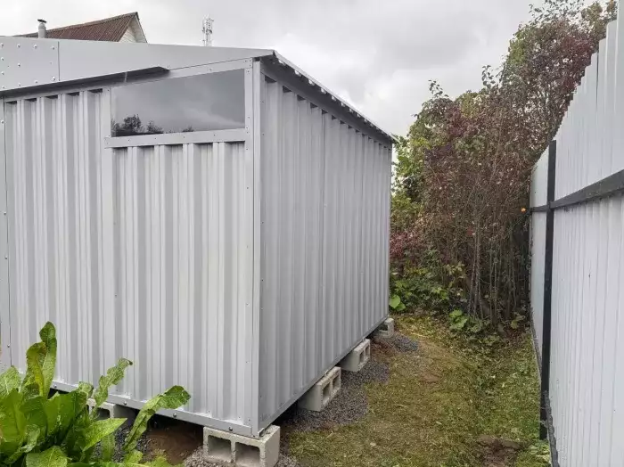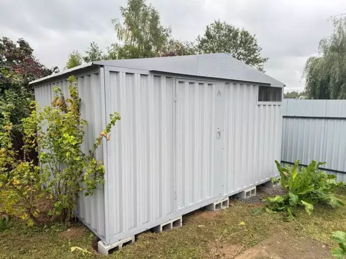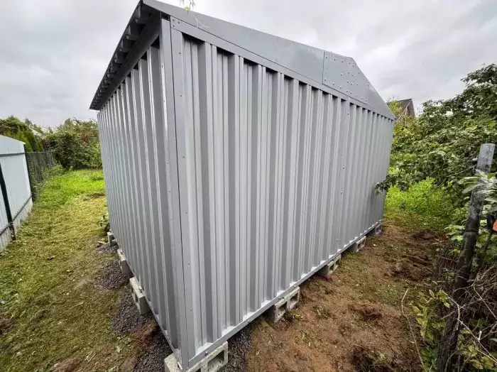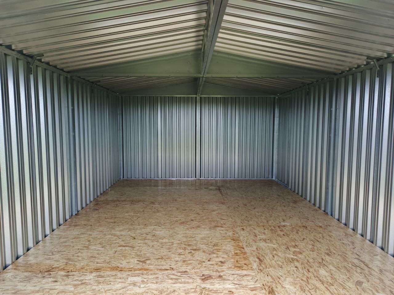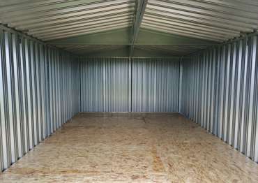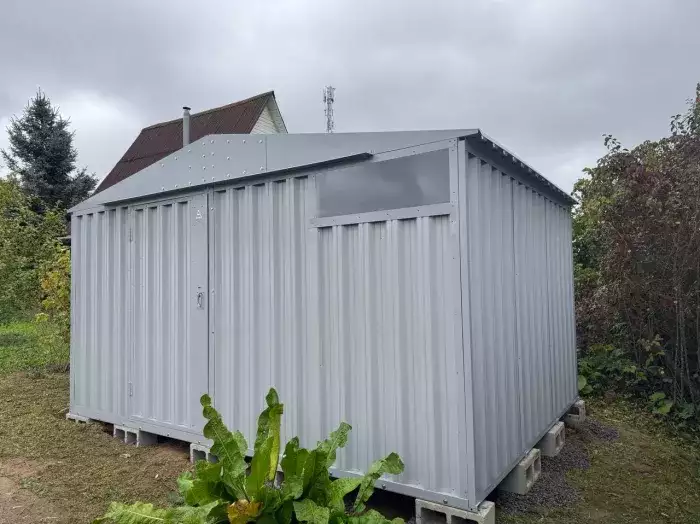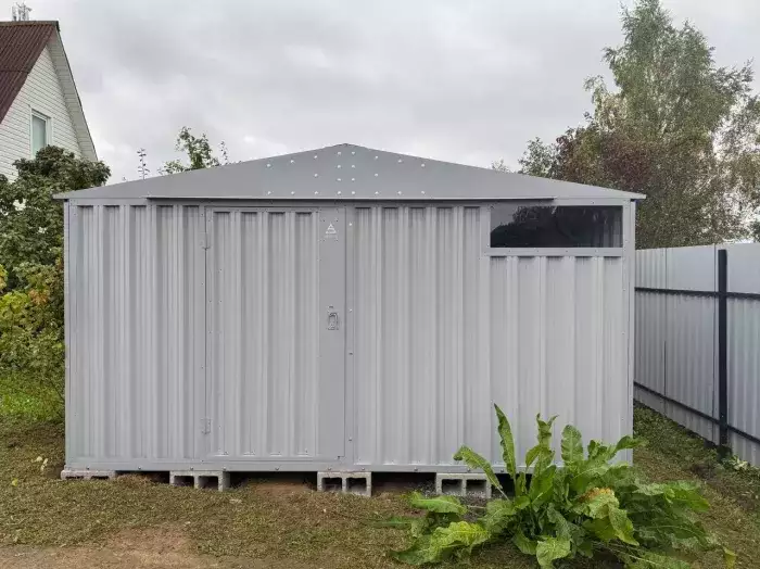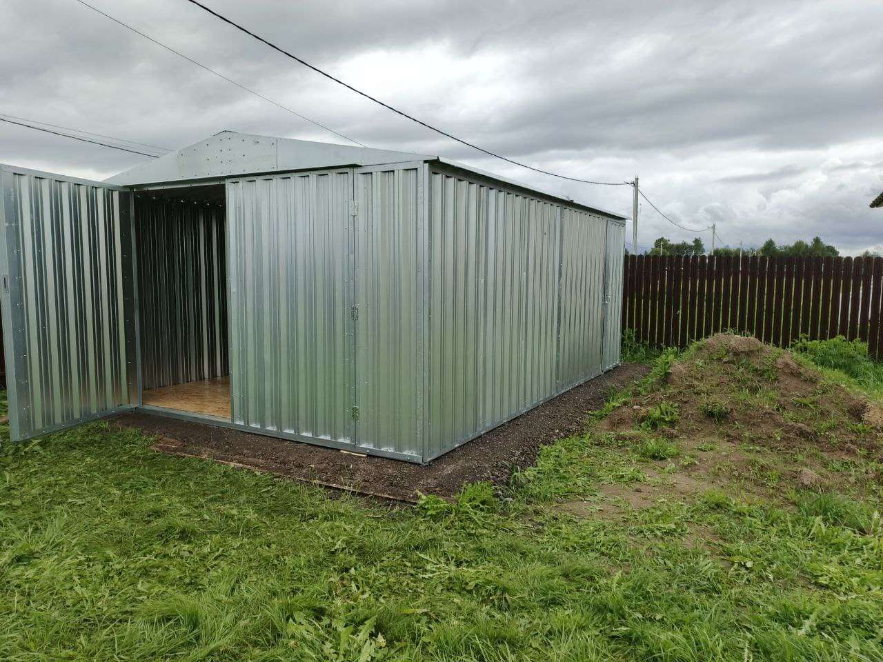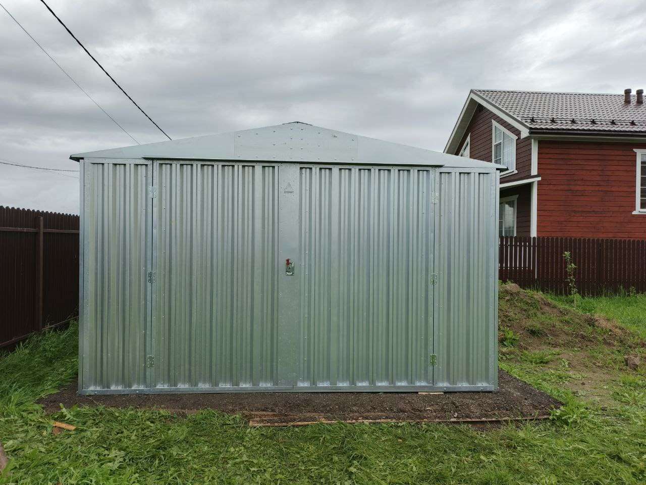 Нами была изготовлена широкая 6-метровая конструкция с увеличенной высотой 2,69 м с двускатной крышей и торцевой воротной группой в блестящем цинковом цвете.