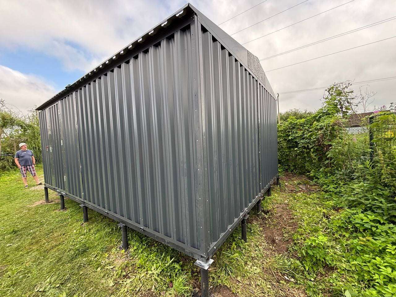 Нами была изготовлена широкая 6-метровая конструкция с двускатной крышей и торцевой воротной группой в строгом графитовом цвете RAL 7024.