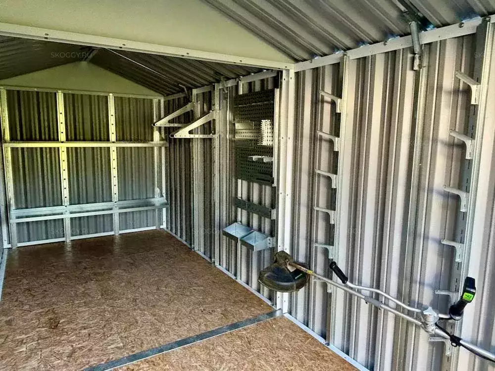 Дополнительно гараж укомплектовали прямым стеллажом с двумя полками, вертикальной стойкой для двух велосипедов, системой хранения инвентаря и инструментальной панелью.