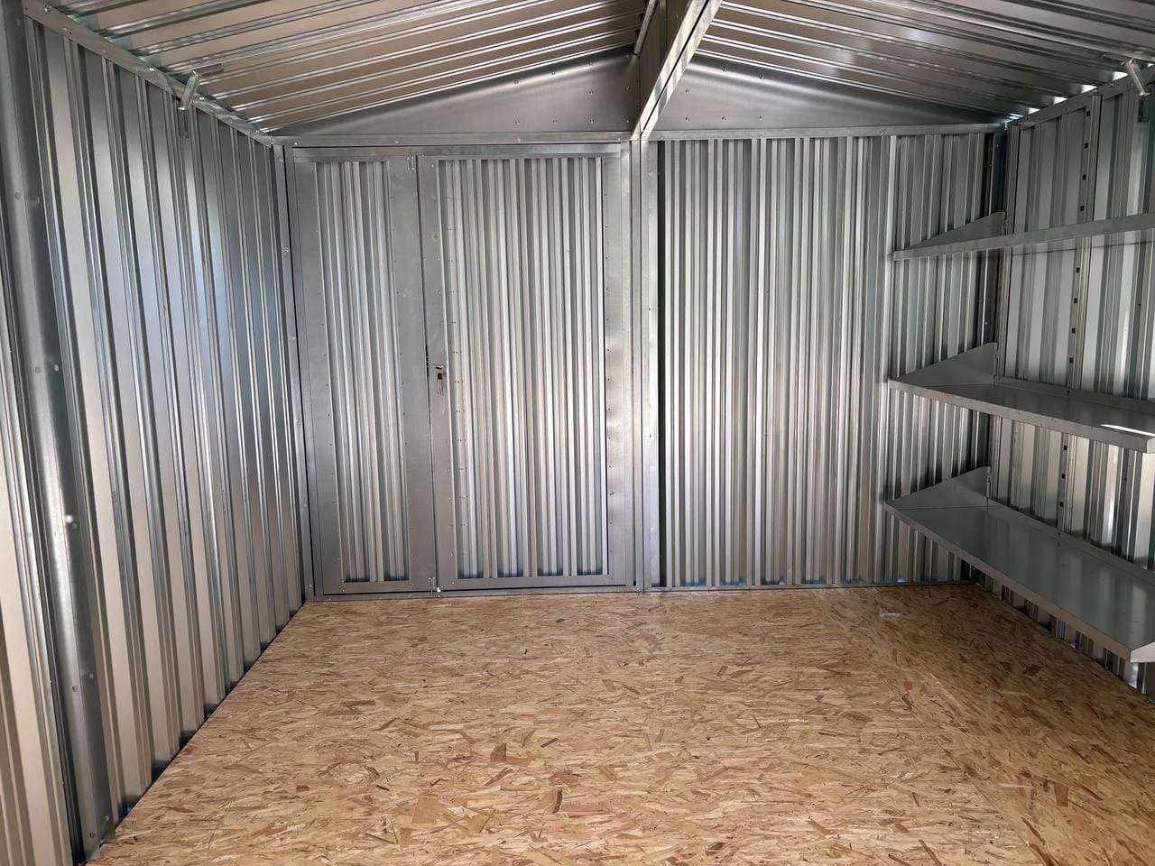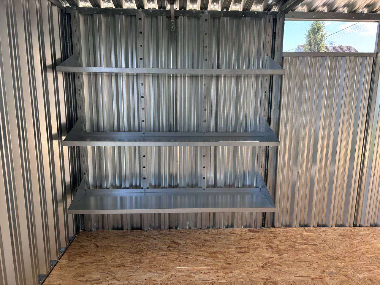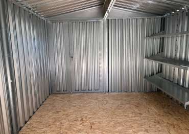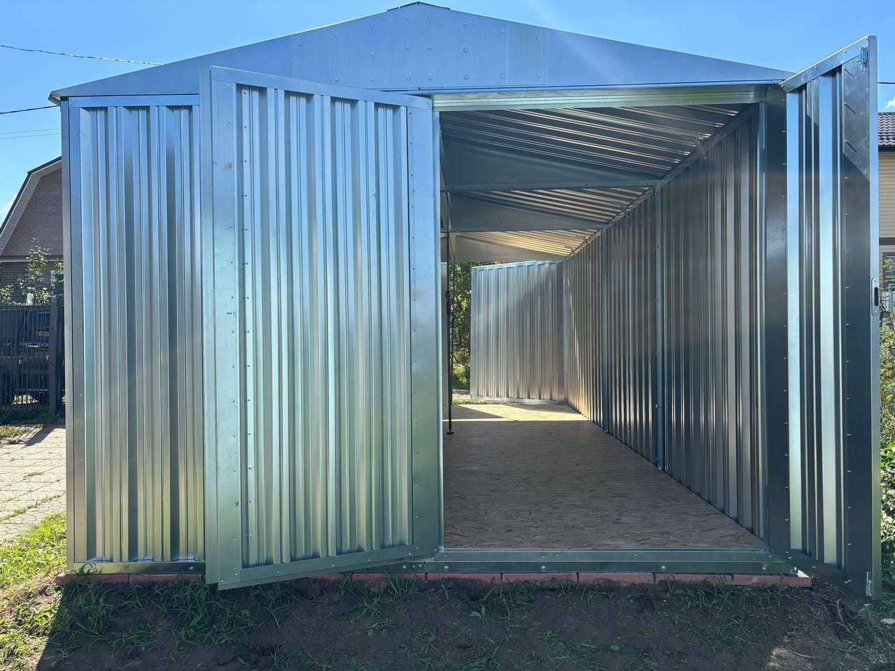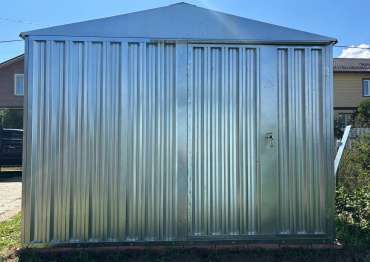 Нами была изготовлена конструкция размером 7 х 3,5 х 2,69 м с двускатной крышей и торцевой воротной группой в блестящем цинковом цвете.