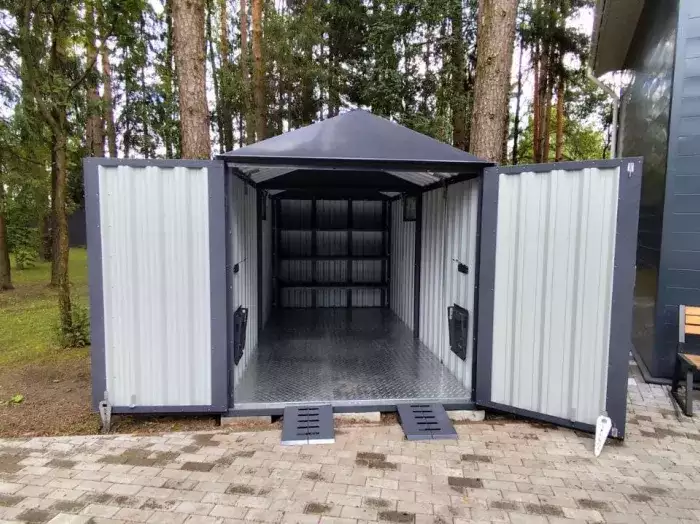 Нами была изготовлена стандартная 4-метровая конструкция с односкатной крышей и торцевой воротной группой в блестящем цинковом цвете. Дополнительно хозблок оборудовали двумя системами хранения инвентаря, а также световым окном 90 х 30 см для проникновения естественного света внутрь помещения.