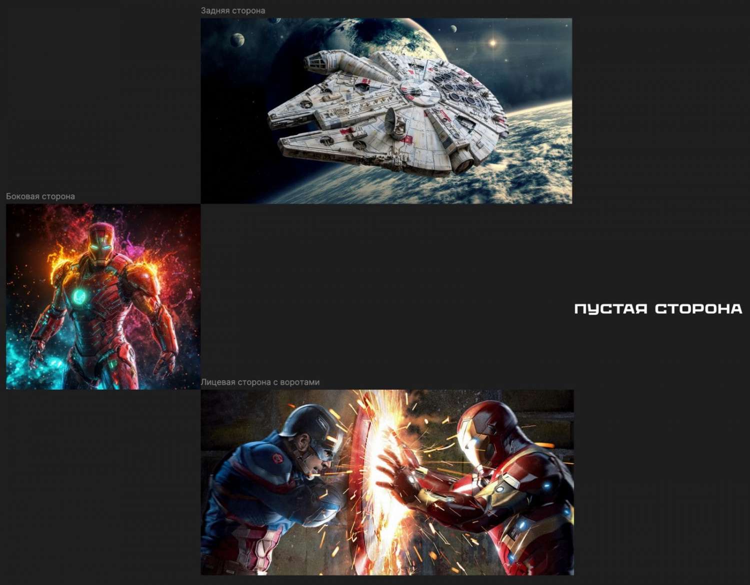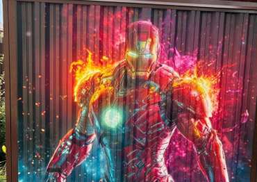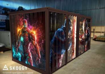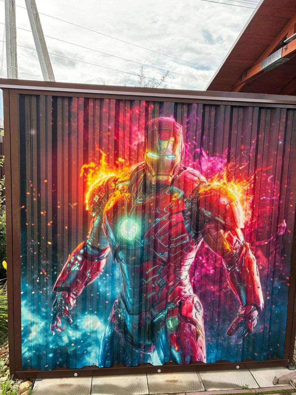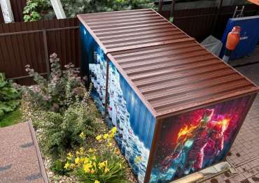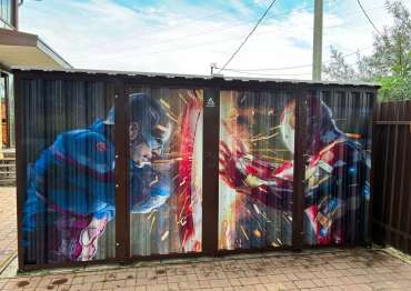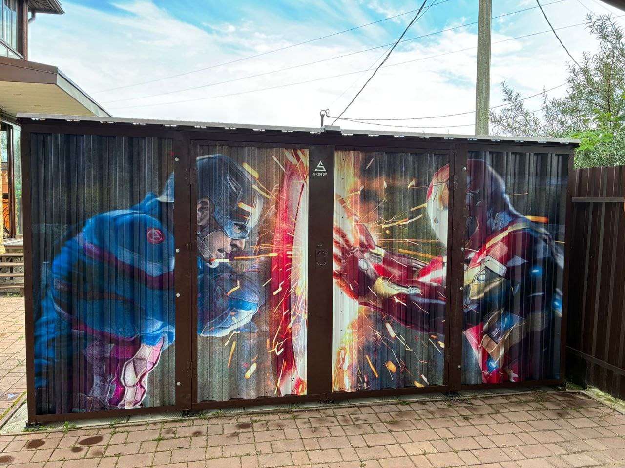 Нами была изготовлена стандартная 4-метровая конструкция с плоской крышей и боковой воротной группой. Все фасонные элементы, крыша и торцевая сторона постройки были выполнены в популярном шоколадно-коричневом цвете RAL 8017, а вот оставшиеся три стороны Алексей решил превратить в произведение искусства, нанеся на них красочный принт с изображением персонажей из фильма «Мстители». Мы с удовольствием поддержали такое решение нашего заказчика!
