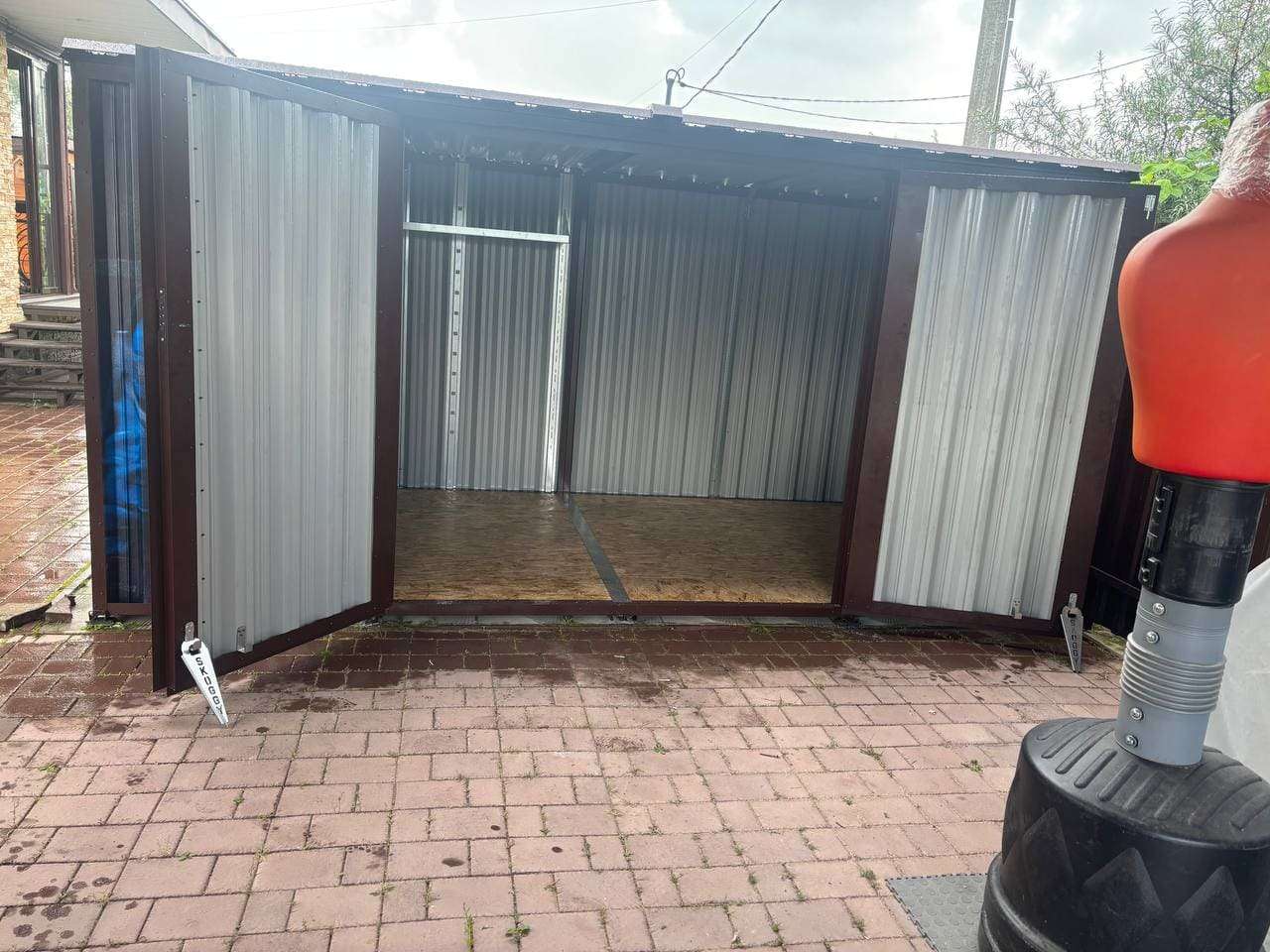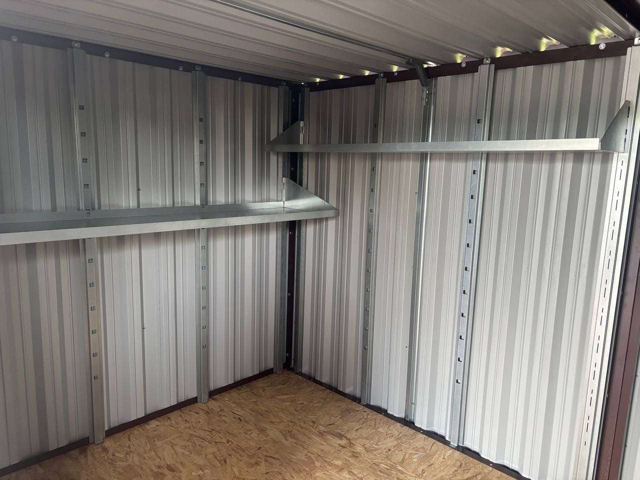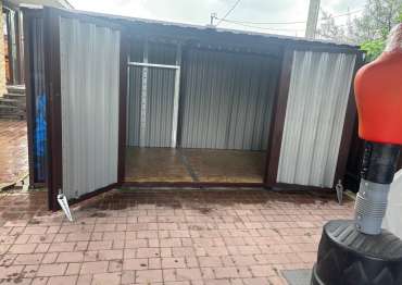 Дополнительно хозблок был оборудован двумя стеллажами с одной полкой глубиной 50 см и 30 см, антивандальным засовом, пандусами для удобного въезда техники, а также упорами для распашных ворот.