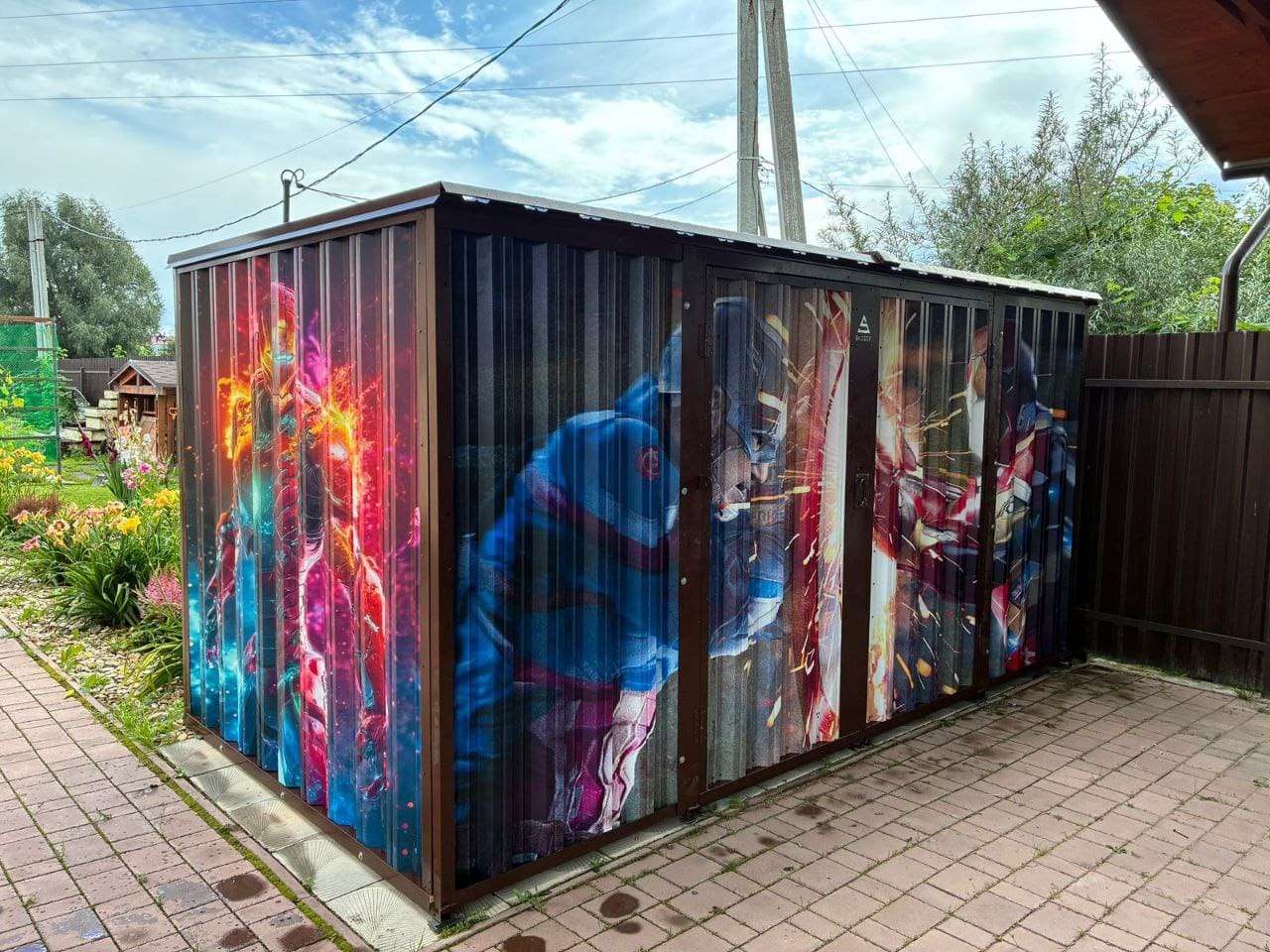 Проект: 4-метровый хозблок для хранения снегоуборщика, мопеда, велосипеда и инветаря с ярким красочным принтом.