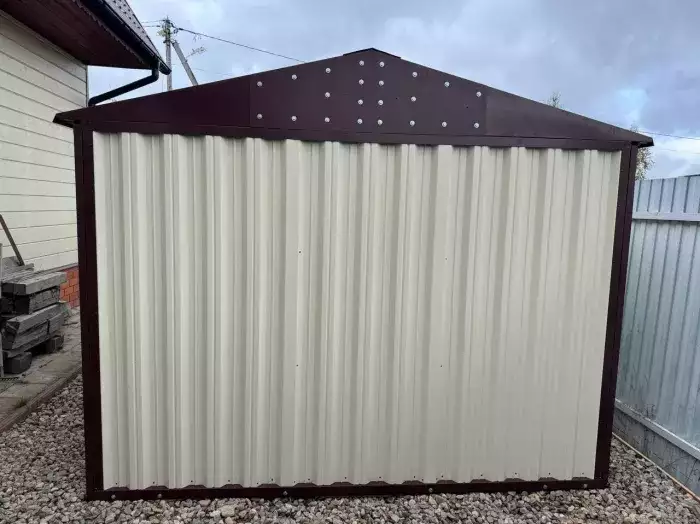 Нами была изготовлена стандартная 6-метровая конструкция с плоской крышей и торцевой воротной группой в блестящем цинковом цвете.