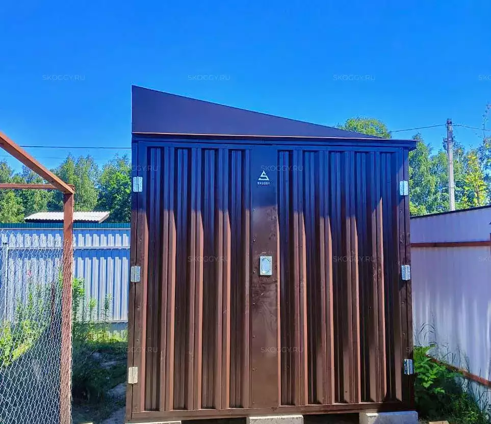 Нами была изготовлена стандартная 4-метровая конструкция с односкатной крышей и торцевой воротной группой в красивейшем шоколадно-коричневом цвете RAL 8017.