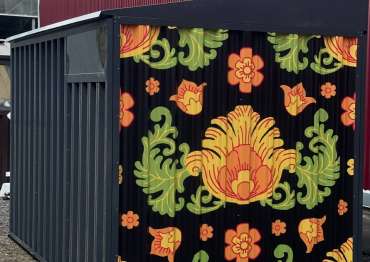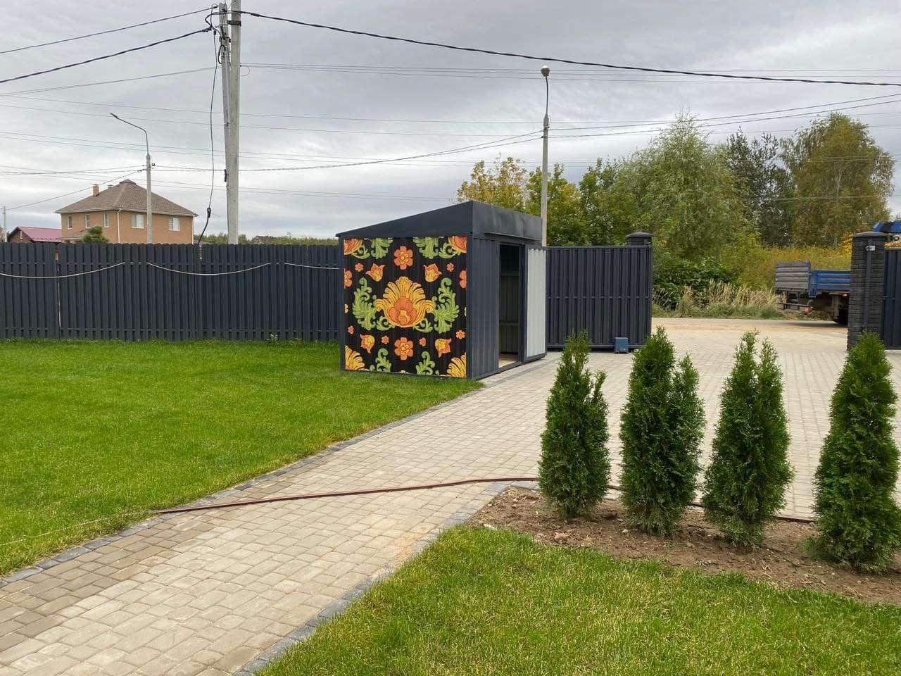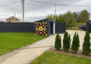 Нами была изготовлена стандартная 3-метровая конструкция с односкатной крышей и боковой дверью в строгом графитовом цвете RAL 7024. А еще на одну из стен изделия был нанесен красивейший принт с Жостовской росписью.