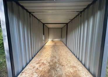 Нами была изготовлена стандартная 6-метровая конструкция с плоской крышей и торцевой входной группой с рольставнями в потрясающей камуфляжной расцветке «милитари». Фасонные элементы и рольставни выполнены в стильном графитовом цвете RAL 7024.