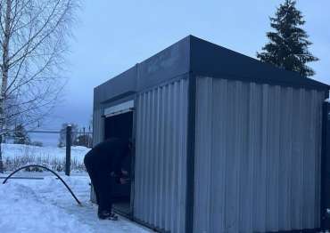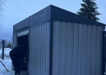 Нами была изготовлена стандартная 5-метровая конструкция с односкатной крышей и боковой входной группой с рольставнями в комбинации расцветок светло-серого RAL 7004 для основных элементов и графитового RAL 7024 для фасонных элементов и крыши.