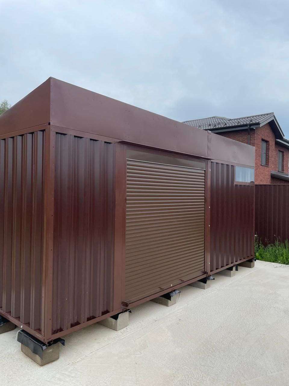 Нами была изготовлена стандартная 5-метровая конструкция с односкатной крышей и боковой входной группой с рольставнями в популярном и стильном шоколадно-коричневом цвете RAL 8017.