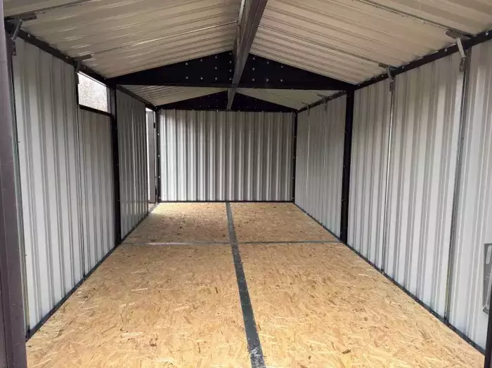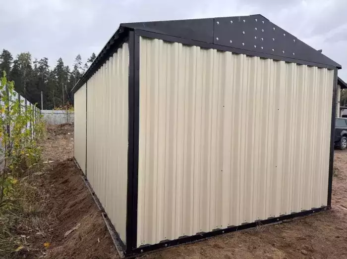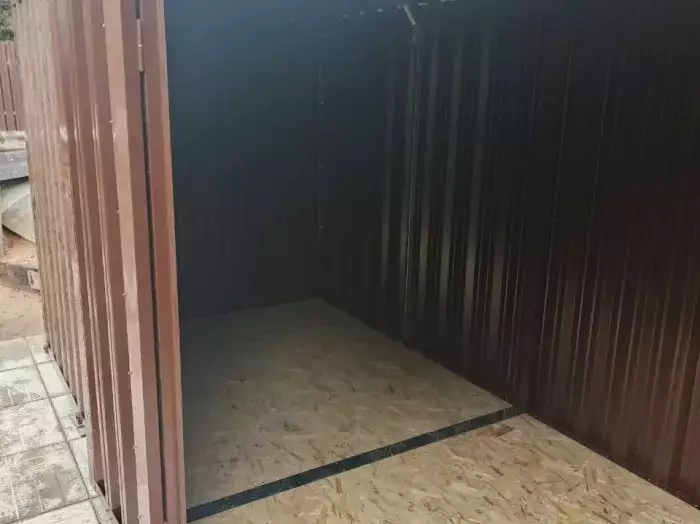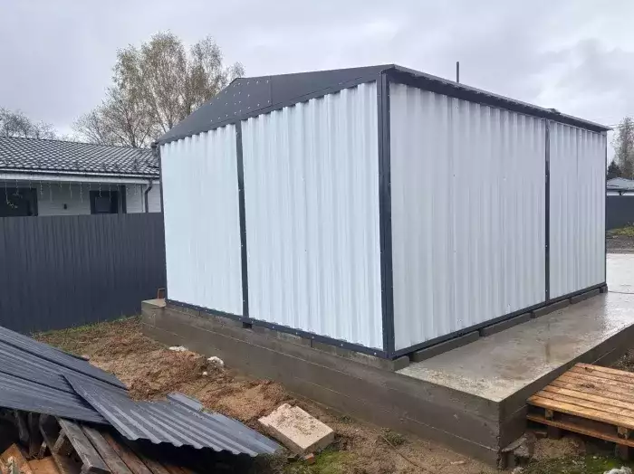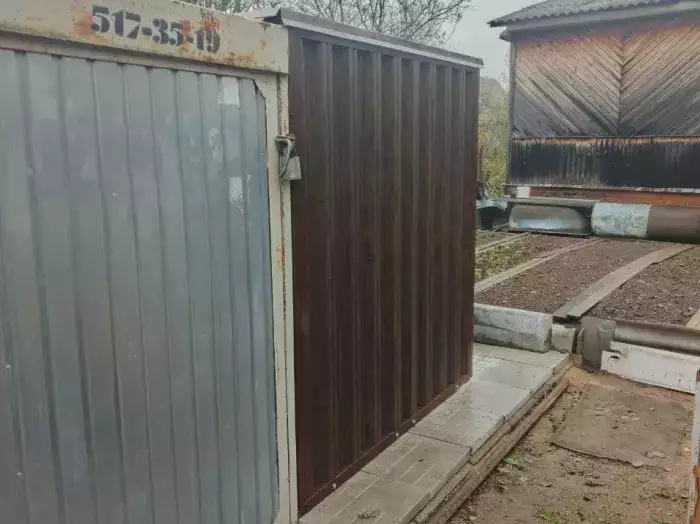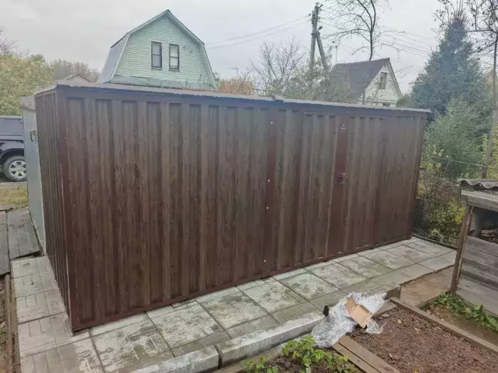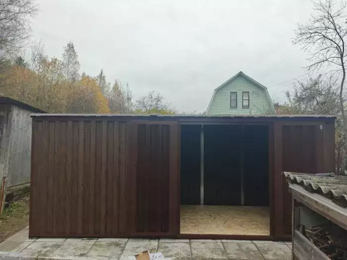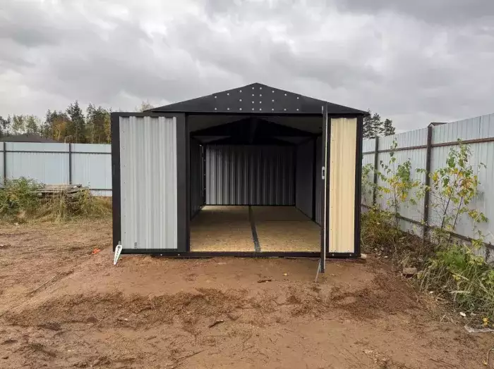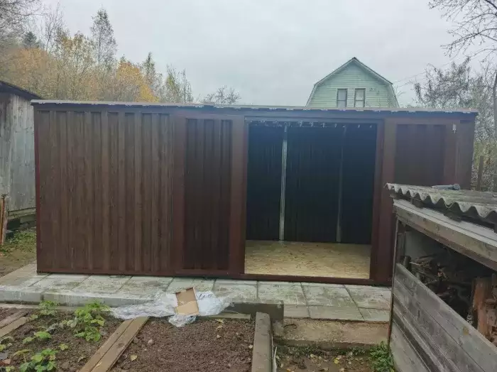Нами была изготовлена стандартная конструкция 2 х 2 м с плоской крышей и торцевой воротной группой в цинковом цвете. По желанию заказчика был усилен пол дополнительным профилем, а также в воротной группе две створки заменили на одну.