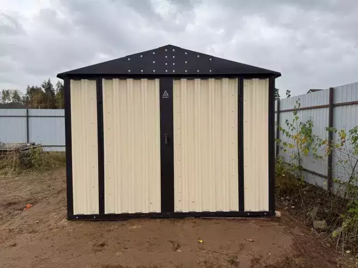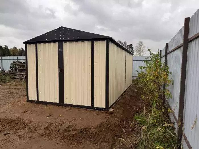 Доставляли изделие манипулятором в собранном виде, так как не было никаких препятствий разгрузке. Установили постройку максимально плотно к забору.