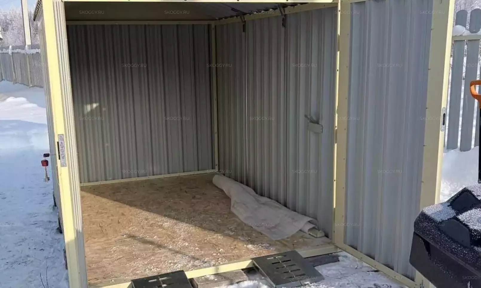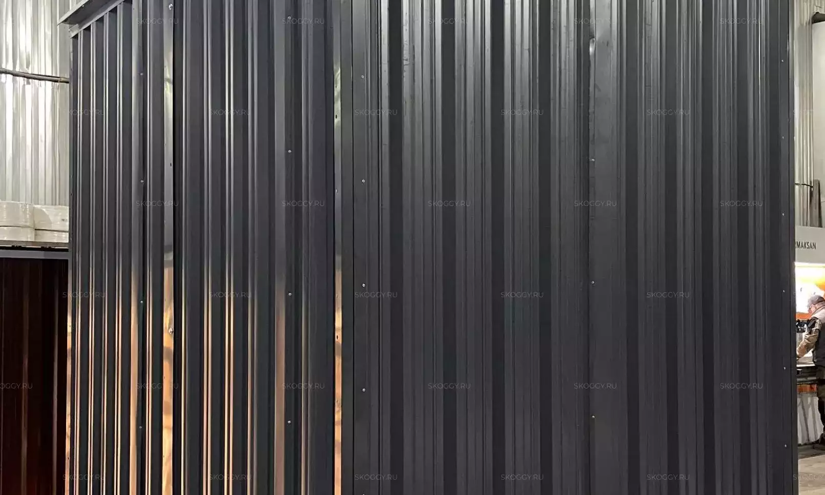 Изготовили 4-метровую конструкцию с плоской крышей и торцевой воротной группой в неизменно популярном графитовом цвете RAL 7024.