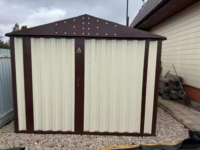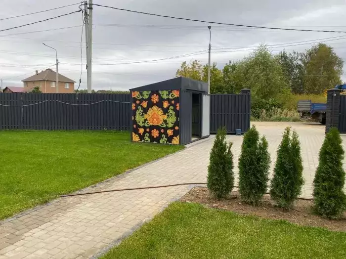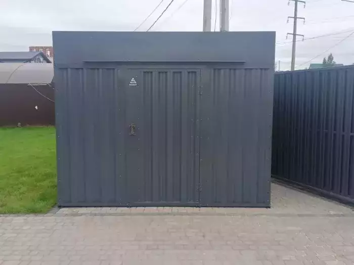 Нами была изготовлена 3-метровая конструкция с плоской крышей и торцевой воротной группой в стильном строгом цвете RAL 9005. Хозблок дополнили пандусами для комфортного въезда техники, а в подарок от SKOGGY заказчик получил упоры для распашных ворот.