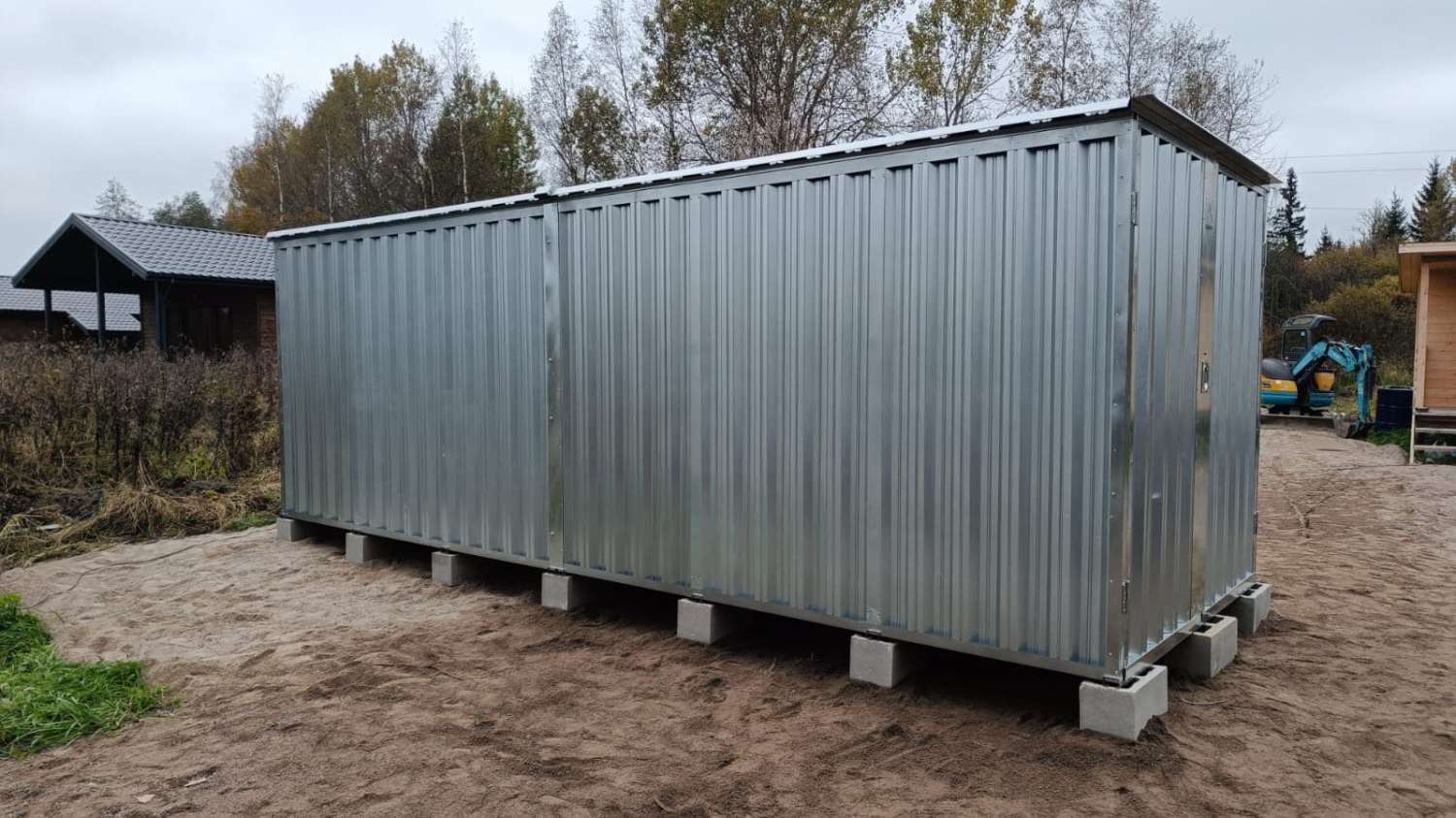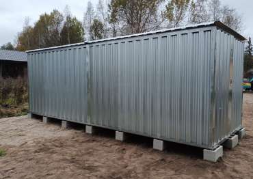 Нами была изготовлена стандартная 6-метровая конструкция с плоской крышей и торцевой воротной группой в блестящем цинковом цвете.