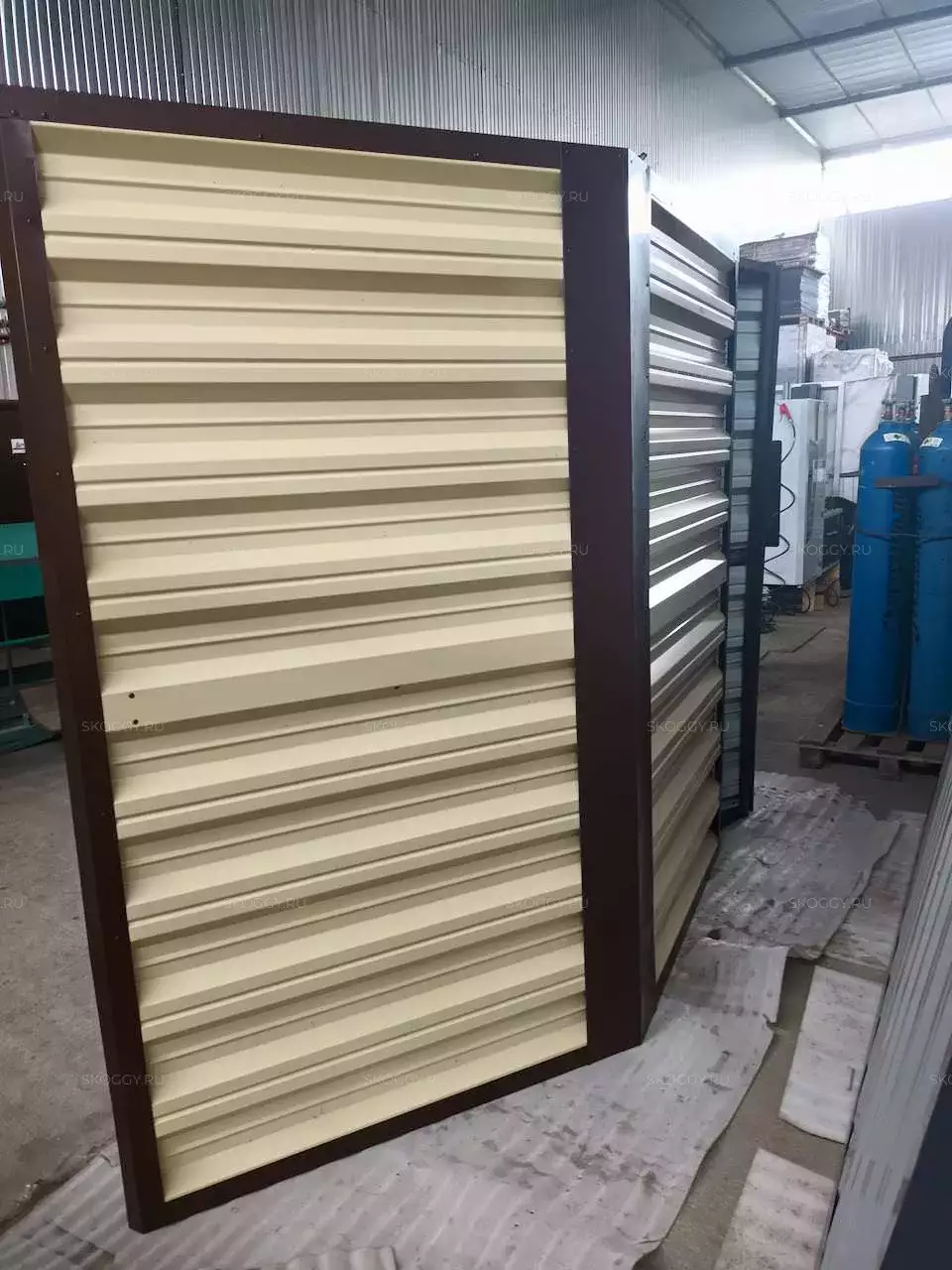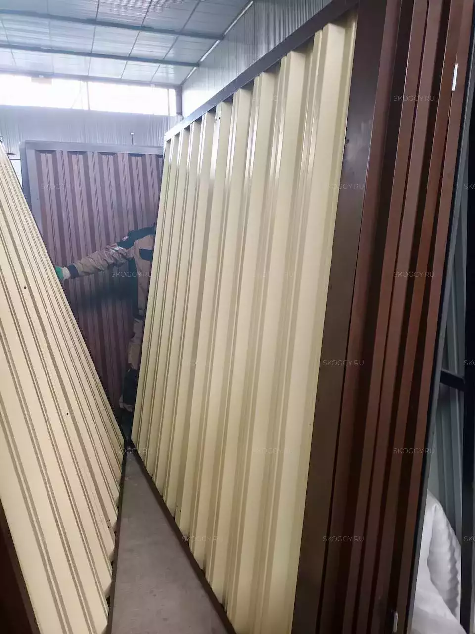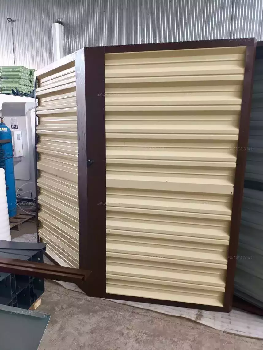 Изначально рассматривался ярко-желтый цвет постройки. Так как такого цвета в стандартной палитре RAL нет, и покраска стоила бы дороже, то решили остановиться на RAL 1015 в тандеме с фасонными элементами RAL 8017. Покупатель остался доволен предложенным вариантом.