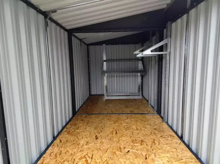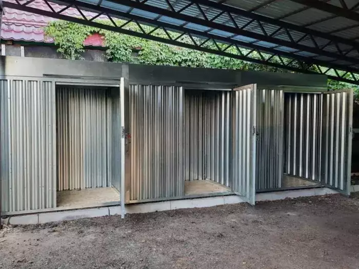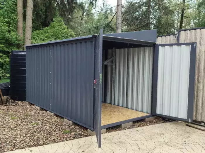 Нами была изготовлена конструкция 3 х 3 м с двускатной крышей и торцевой воротной группой в популярном шоколадно-коричневом цвете RAL 8017.