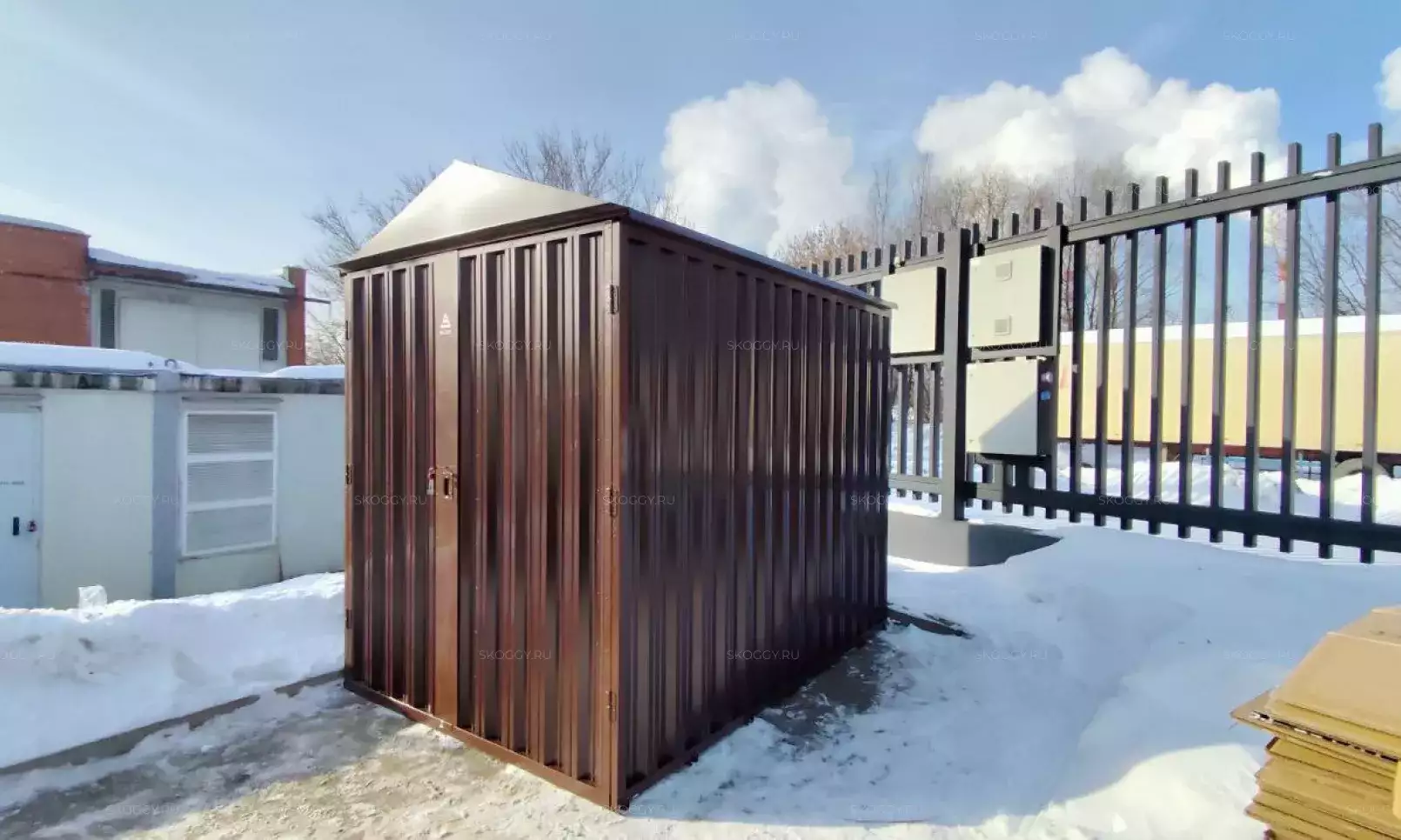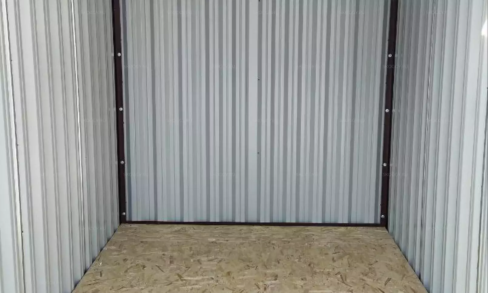 Нами была изготовлена стандартная 3-метровая конструкция с плоской крышей и торцевой воротной группой в блестящем цинковом цвете.