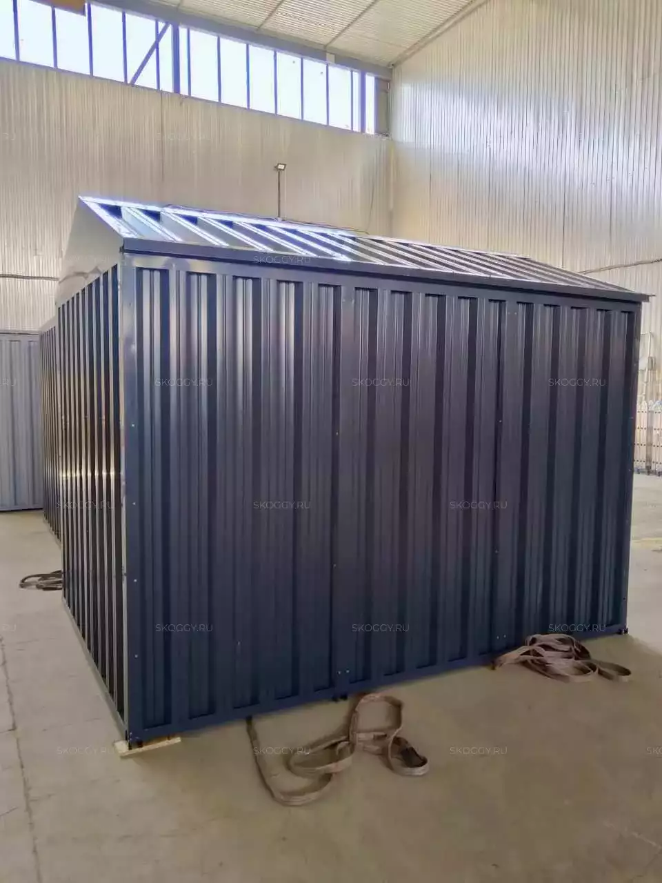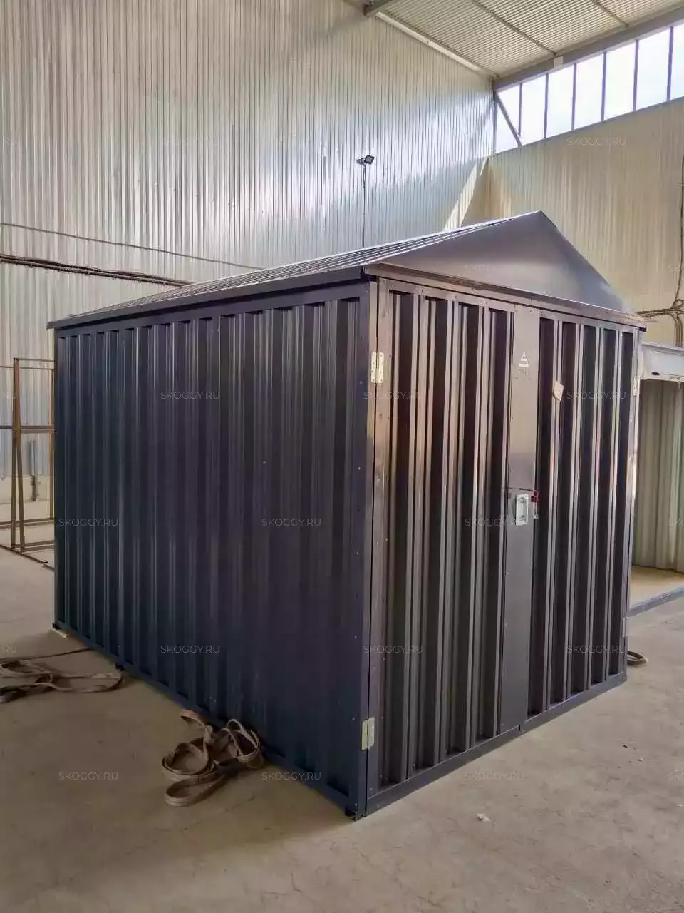 Нами была изготовлена стандартная 3-метровая конструкция с двускатной крышей и торцевой воротной группой в строгом графитовом цвете RAL 7024.