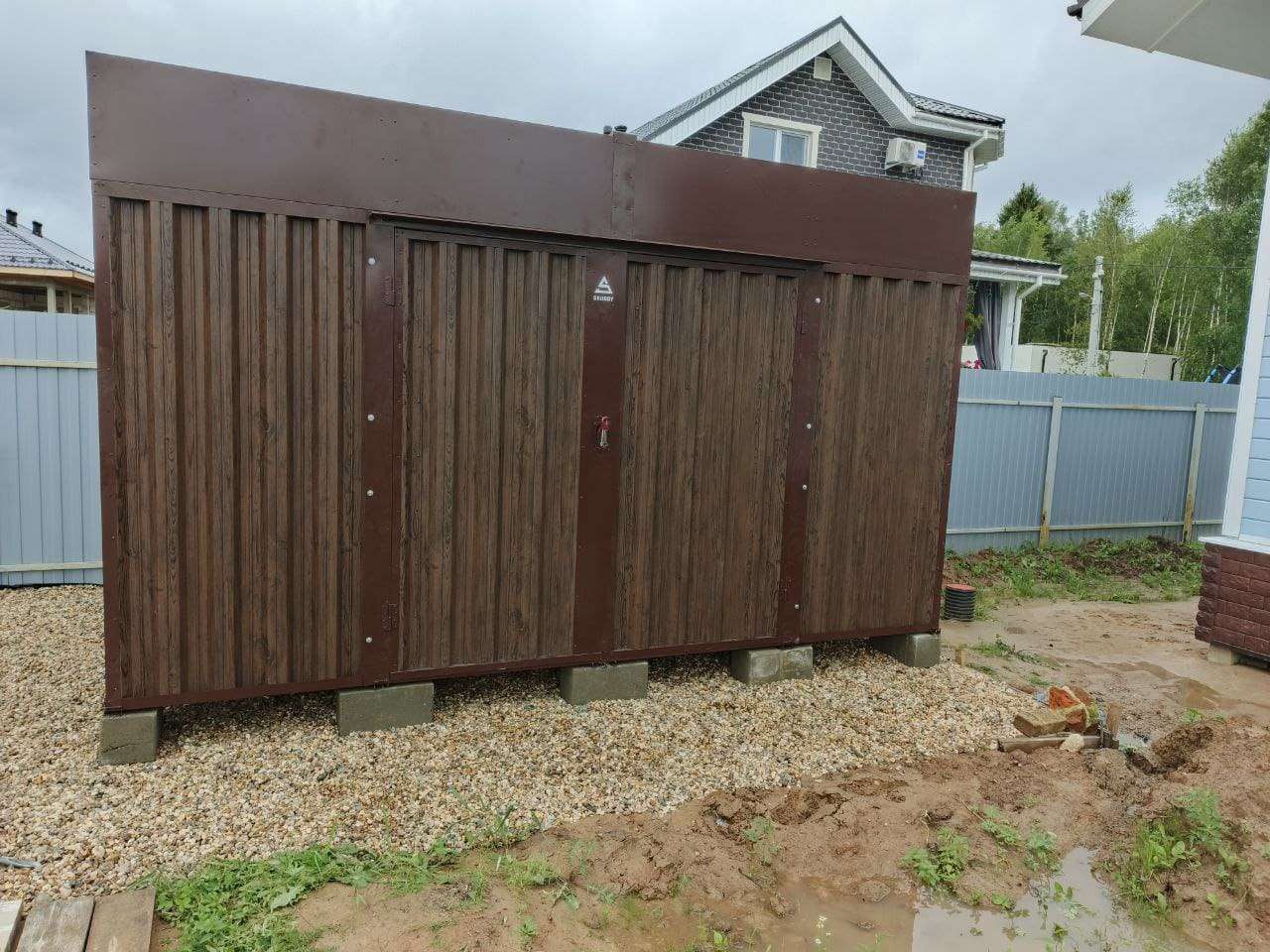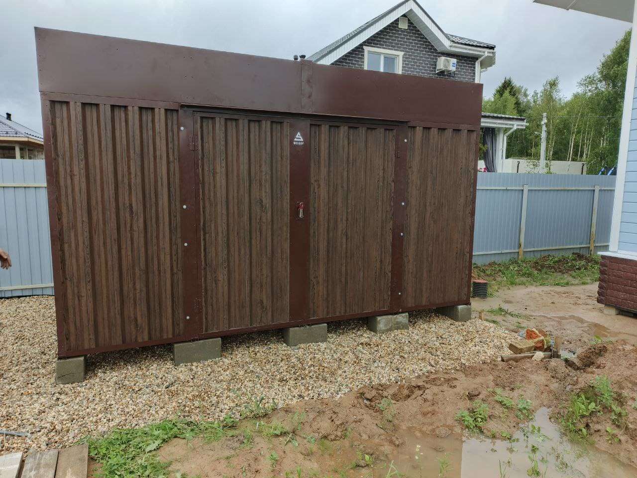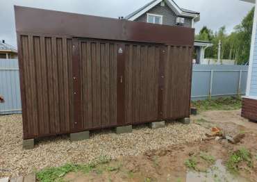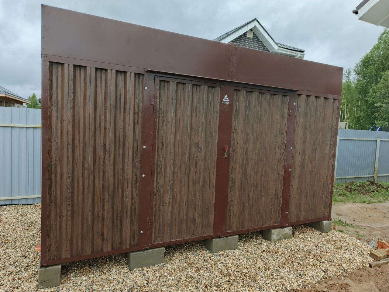 Нами была изготовлена стандартная 4- метровая конструкция с односкатной крышей и боковой воротной группой в популярной расцветке «под дерево» Темный дуб.