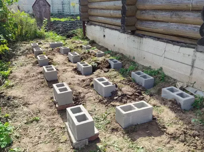 Площадку под постройку Николай подготовил самостоятельно. Была сделана подушка из щебня, а сверху были расставлены бетонные блоки по рекомендованной нами схеме расстановки точек опор, чтобы конструкция стала чуть выше.