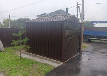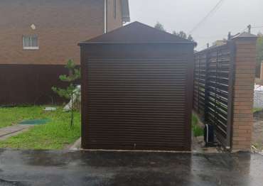 Нами была изготовлена стандартная 3-метровая конструкция с двускатной крышей и торцевой входной группой с рольставнями в неизменно популярном шоколадно-коричневом цвете RAL 8017. Именно такой цвет для постройки был выбран для того, чтобы она гармонировала с цветом забора на участке.