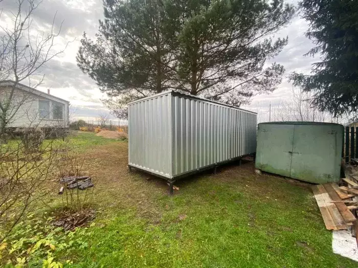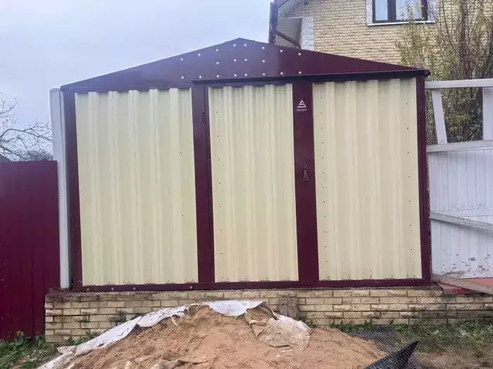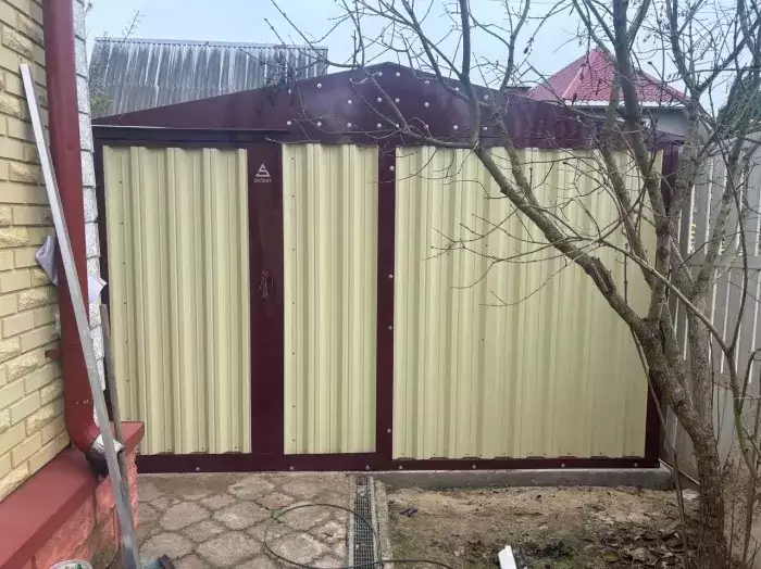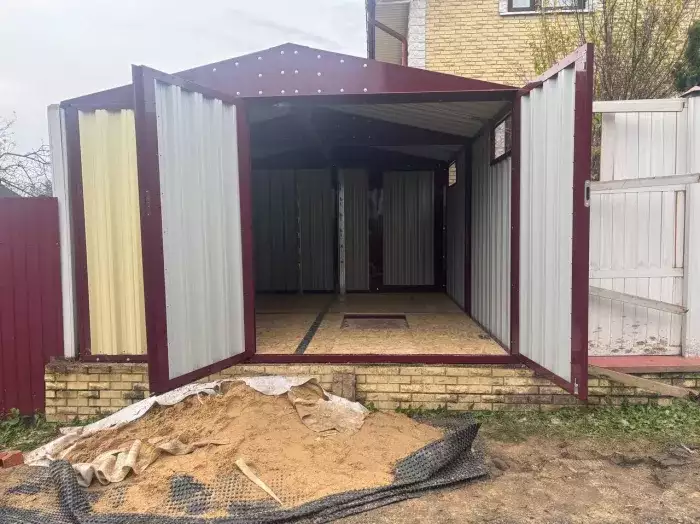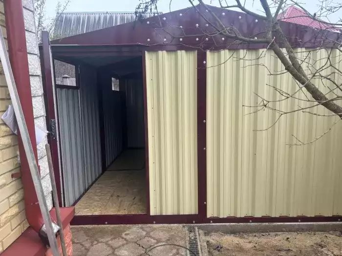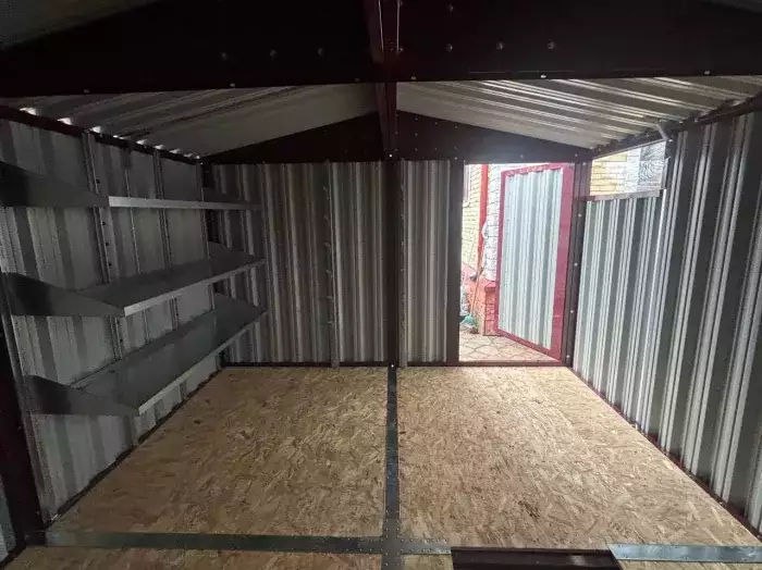 Нами была изготовлена стандартная 4-метровая конструкция с односкатной крышей и боковой воротной группой в сочном зеленом цвете RAL 6005. Дополнительно хозблок оборудовали системой хранения инвентаря.