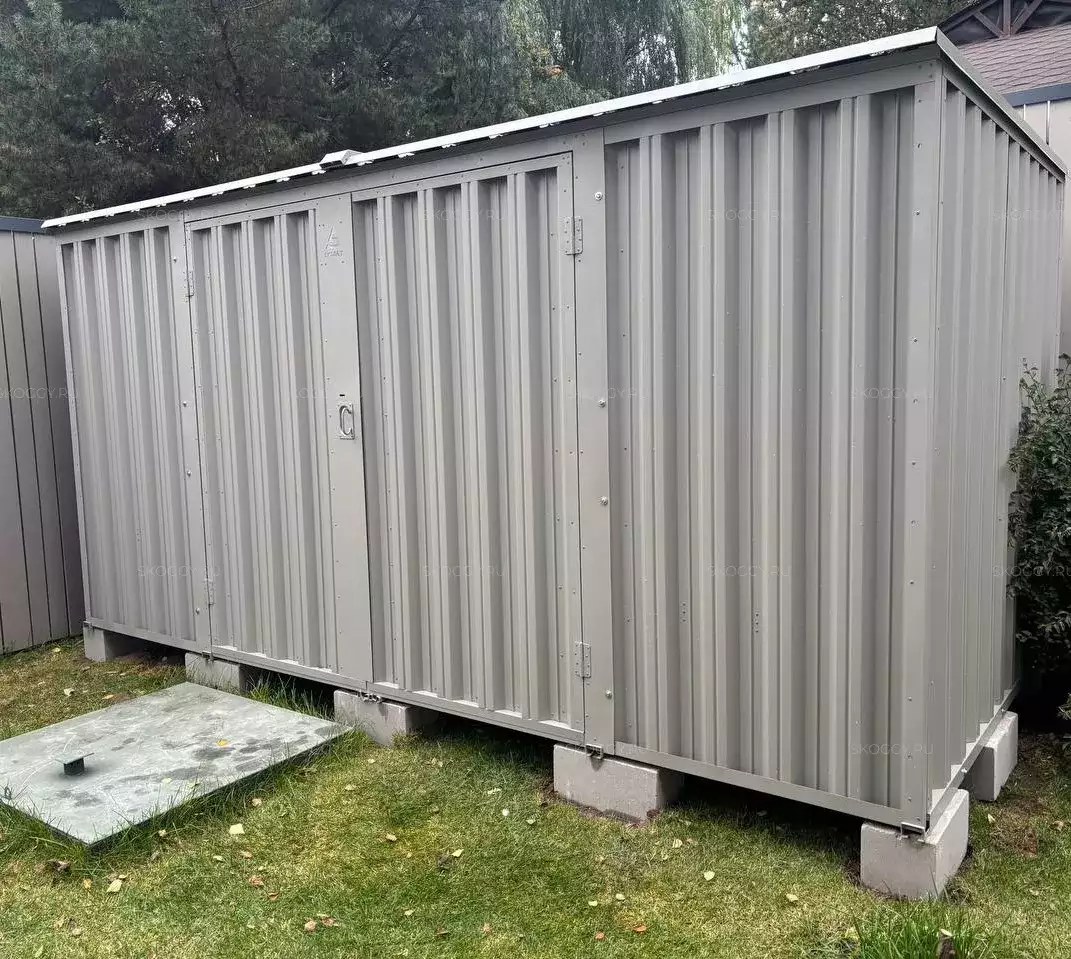Проект: 4-метровый хозблок для хранения садовой техники и инвентаря в каменно-сером цвете.