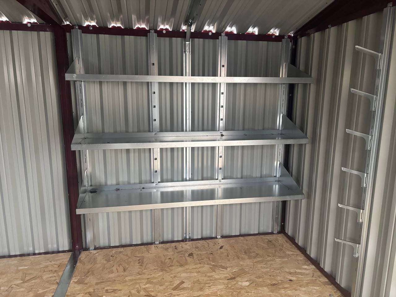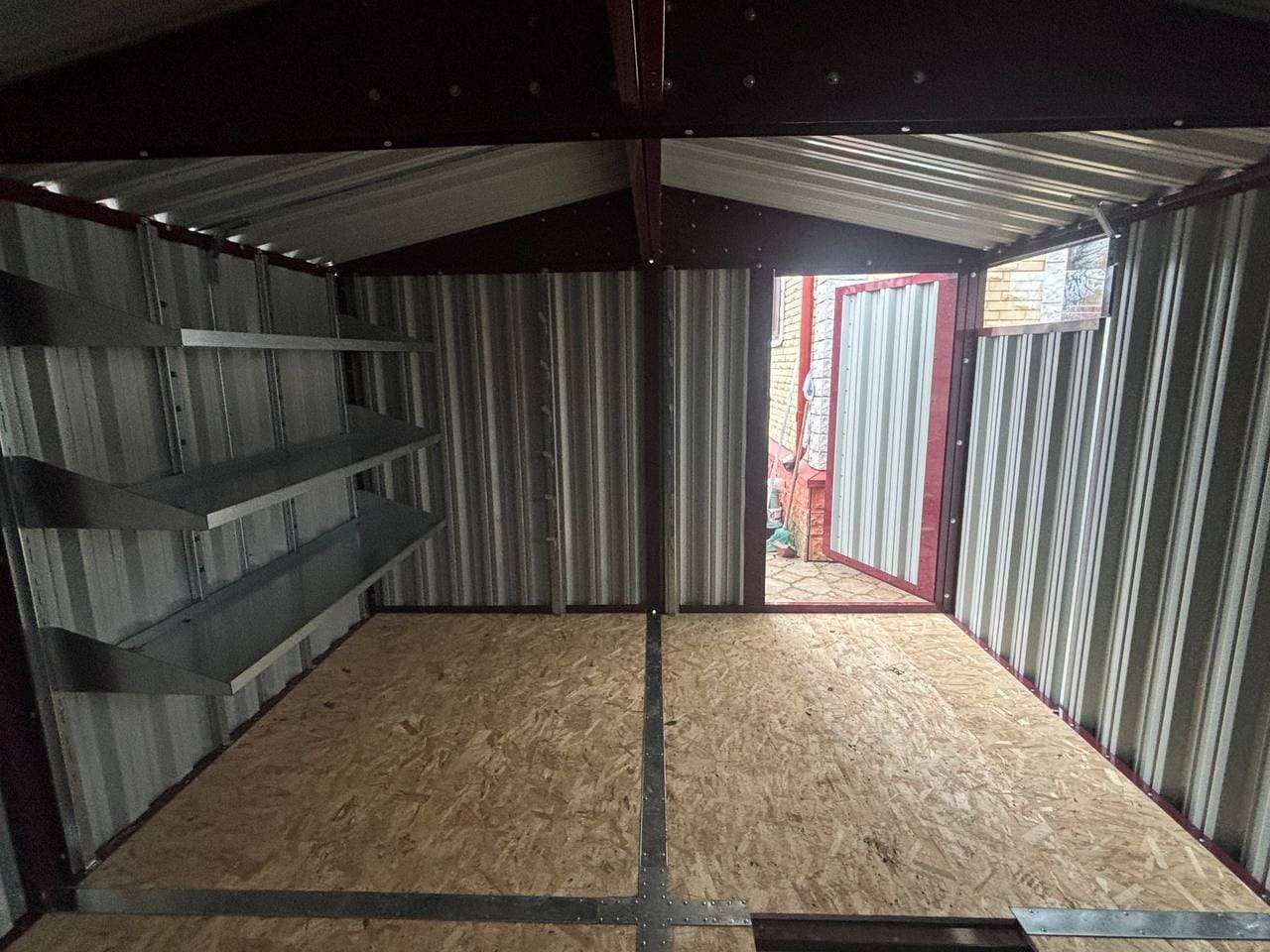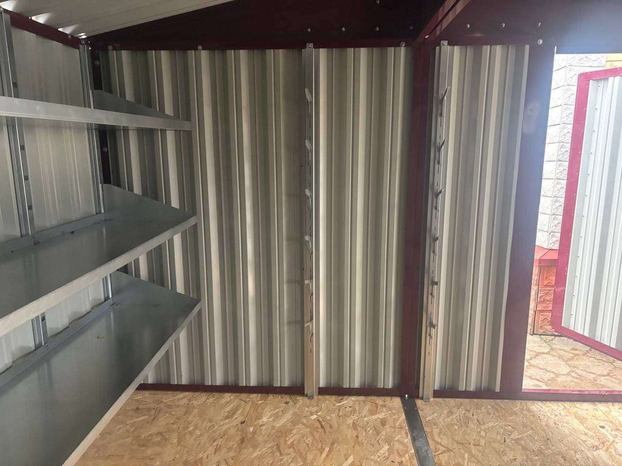 Дополнительно хозблок оборудован стеллажом с тремя полками, системой хранения инвентаря, двумя световыми окнами размером 90 х 30 см, а также дополнительной входной дверью шириной 1 м.