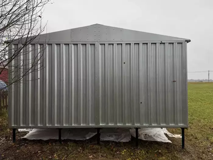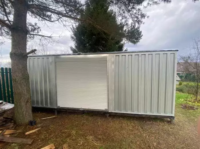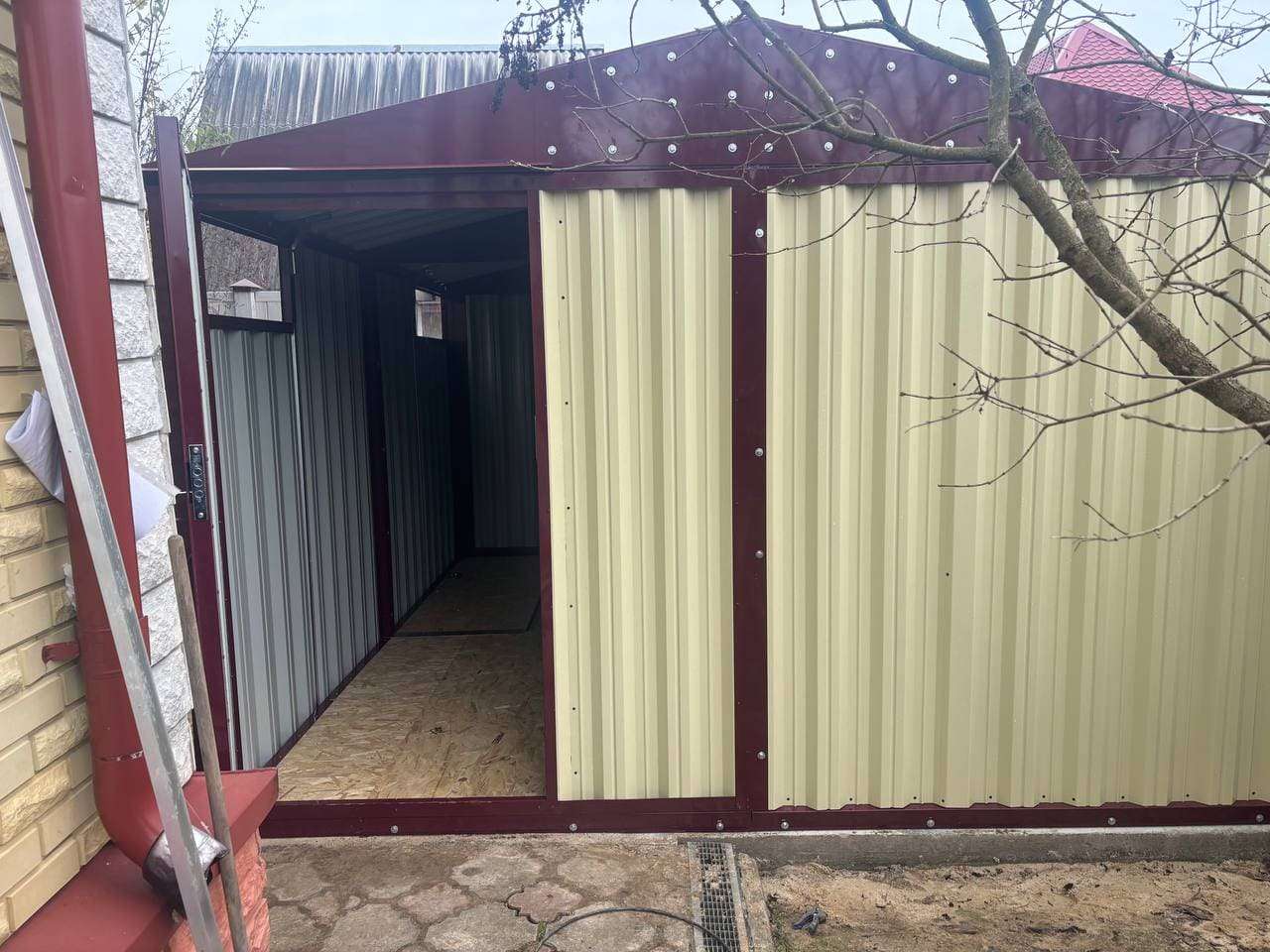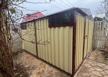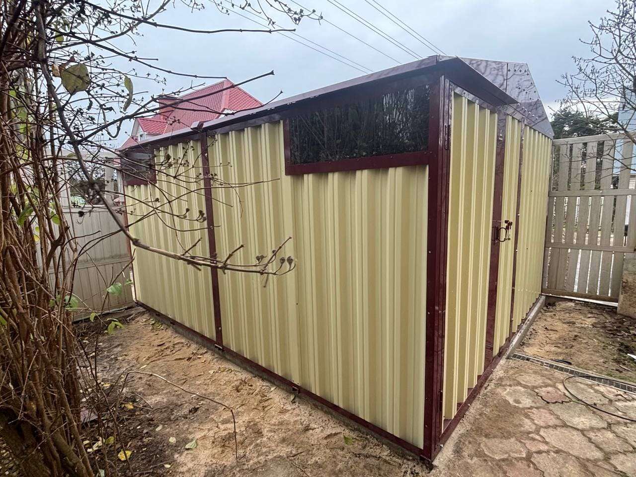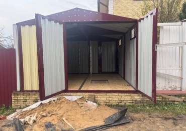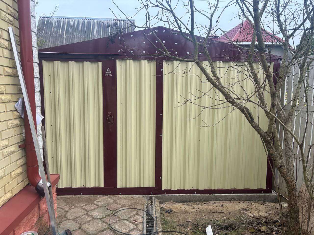 Нами была изготовлена конструкция размером 4,12 х 3,5 х 2,45 м с двускатной крышей и торцевой воротной группой в потрясающем сочетании расцветок RAL 1014 «слоновая кость» для основных элементов и винно-красного RAL 3005 для фасонных элементов и крыши. Именно такая расцветка была выбрана для того, чтобы постройка гармонировала по цвету с фасадом жилого дома на участке.