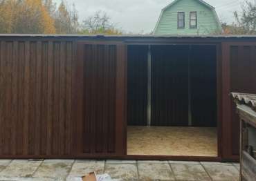 Нами была изготовлена конструкция размером 5 х 1,97 м с плоской крышей и боковой воротной группой в комбинации расцветок «под дерево» Темный дуб для основных элементов и шоколадно-коричневого RAL 8017 для фасонных элементов и крыши.