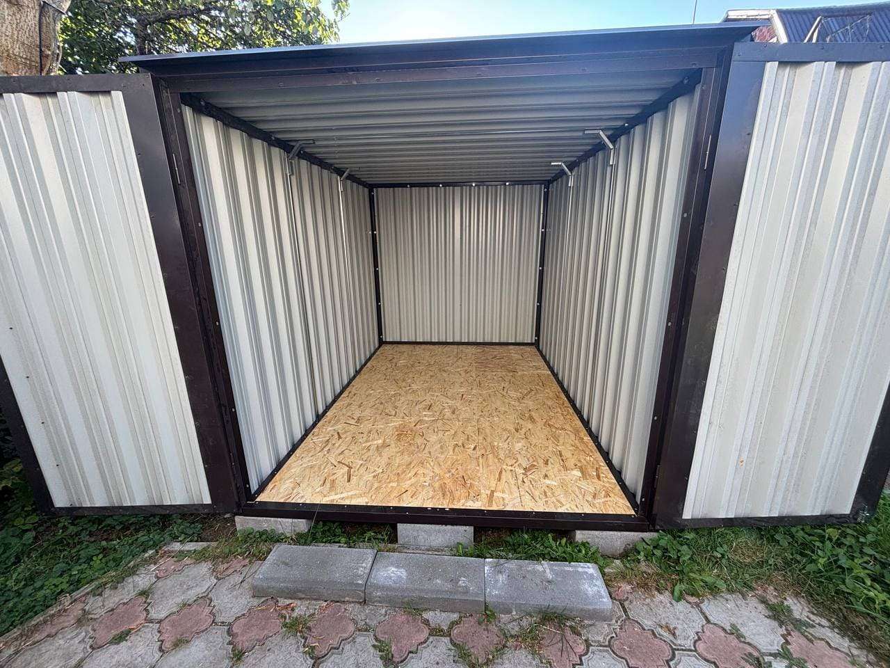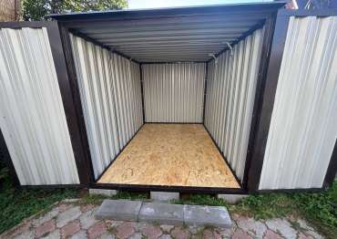 Нами была изготовлена стандартная 3-метровая конструкция с плоской крышей и торцевой воротной группой в стильном серо-коричневом цвете RAL 8019.