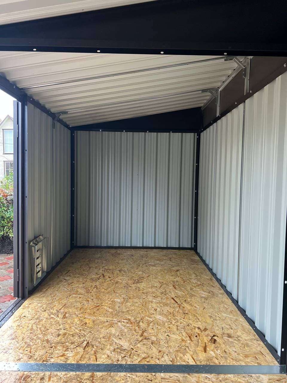 Проект: 6-метровый хозблок для хранения садовой техники и инвентаря в серо-коричневом цвете.
