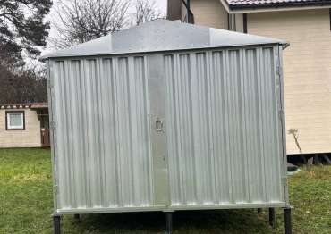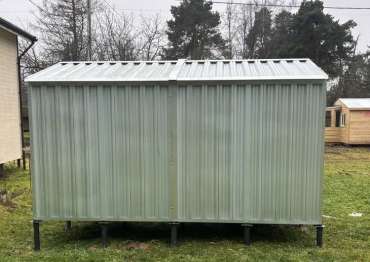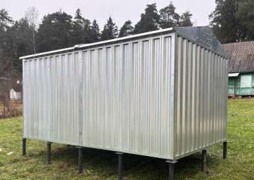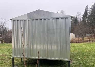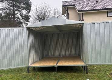 Нами была изготовлена конструкция размером 4 х 3 м с двускатной крышей и торцевой воротной группой в блестящем цинковом цвете.