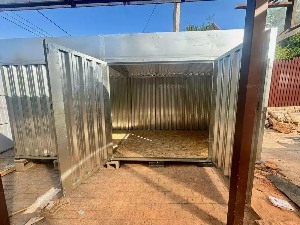 Нами была изготовлена стандартная 5-метровая конструкция с односкатной крышей и боковой воротной группой в блестящем цинковом цвете.