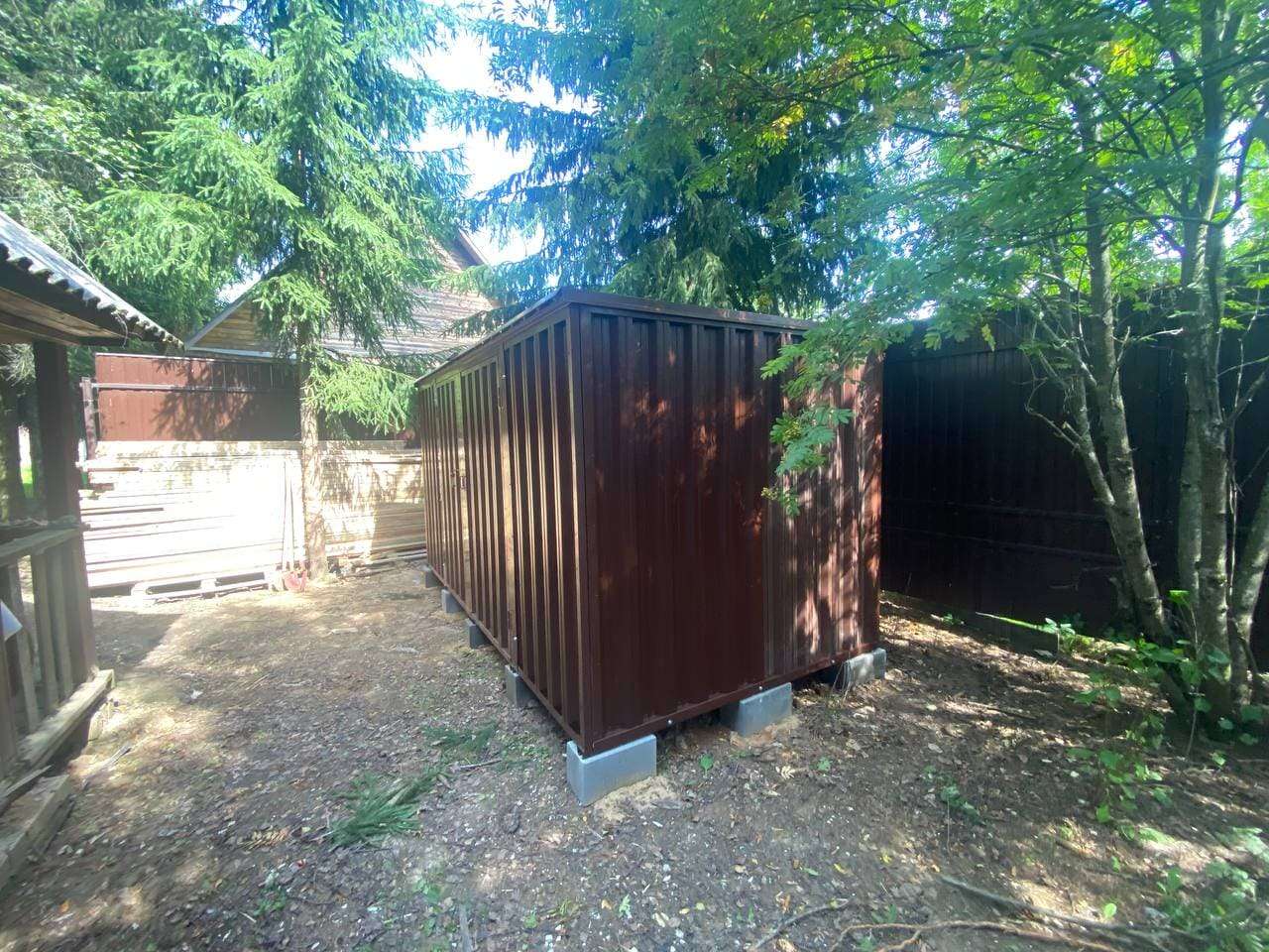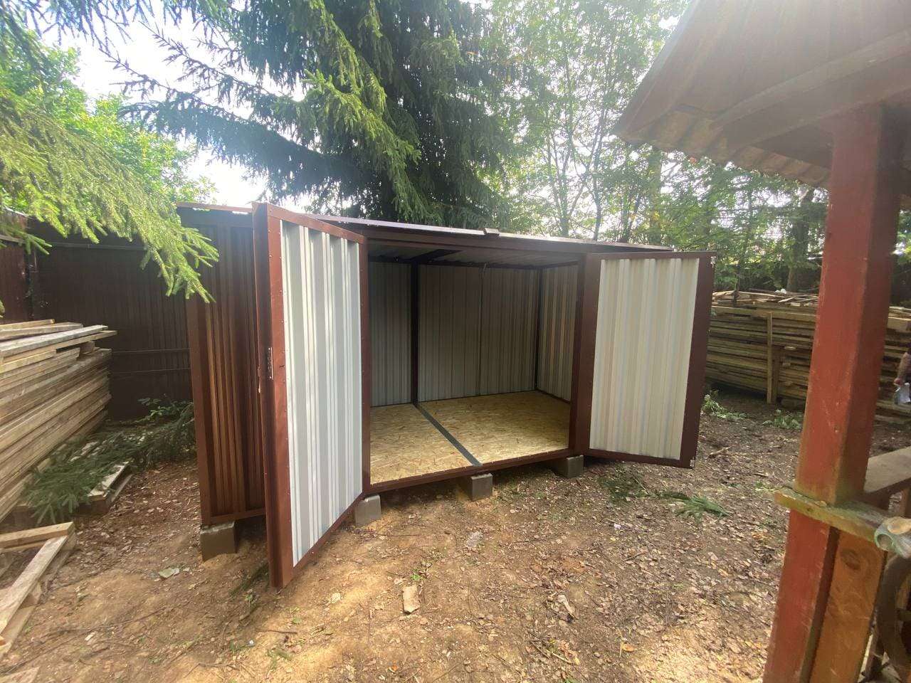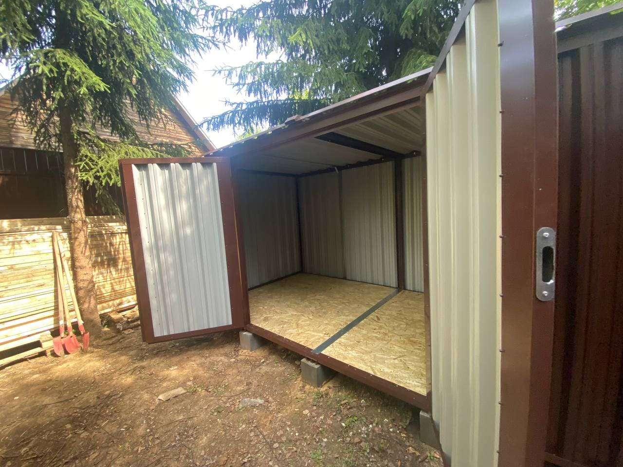 Проект: 4-метровый хозблок для хранения строительных инструментов и снегоуборочной техники в шоколадно-коричневом цвете.