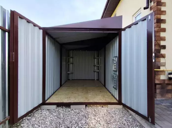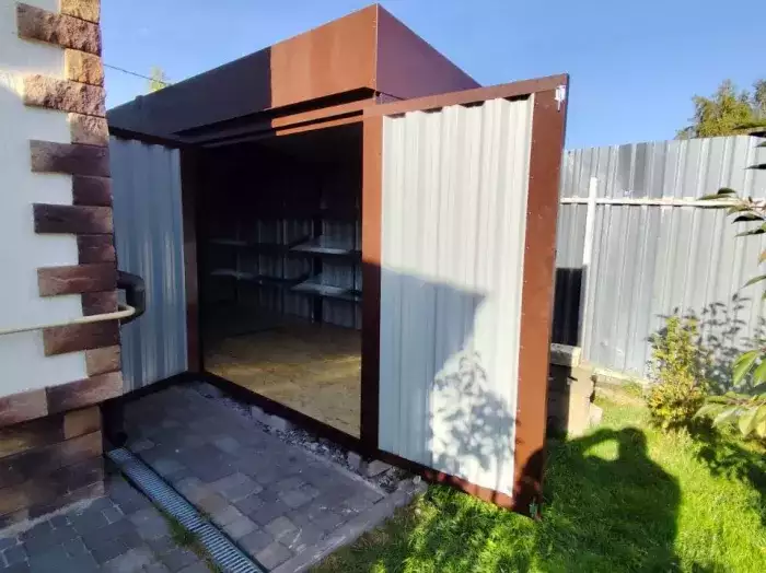 Нами была изготовлена широкая 3-метровая конструкция с двускатной крышей и торцевой воротной группой в сигнальном сером цвете RAL 7004.