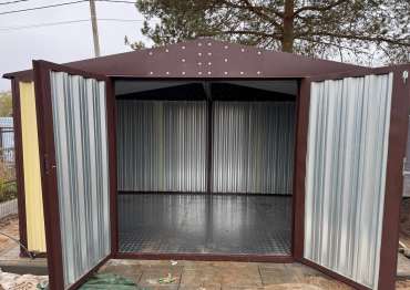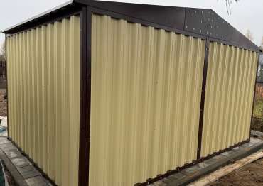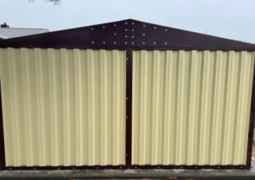 Нами была изготовлена широкая 3-метровая конструкция с двускатной крышей и торцевой воротной группой в потрясающе красивом сочетании расцветок нежного RAL 1014 «слоновая кость» для основных элементов и шоколадно-коричневого RAL 8017 для фасонных элементов и крыши. По желанию заказчика изделие выполнено из листа толщиной 0,7 мм.